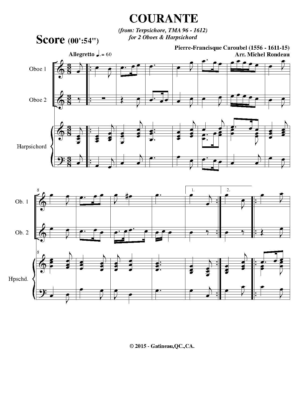 These pieces were assembled and arranged by Praetorius for his 1612 collection. It is unknown how many, or if any, of the works in the collection were actually composed by Caroubel as opposed to being popular dance tunes arranged by him. The instrumentation is not specified in the original, and simply listed as "à 5"
