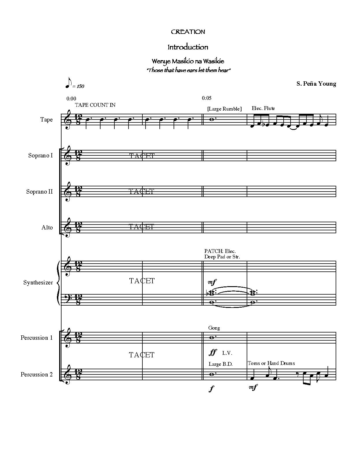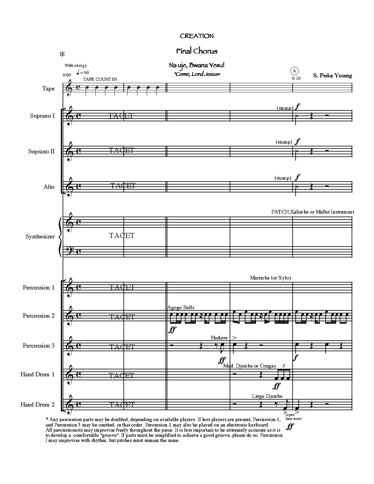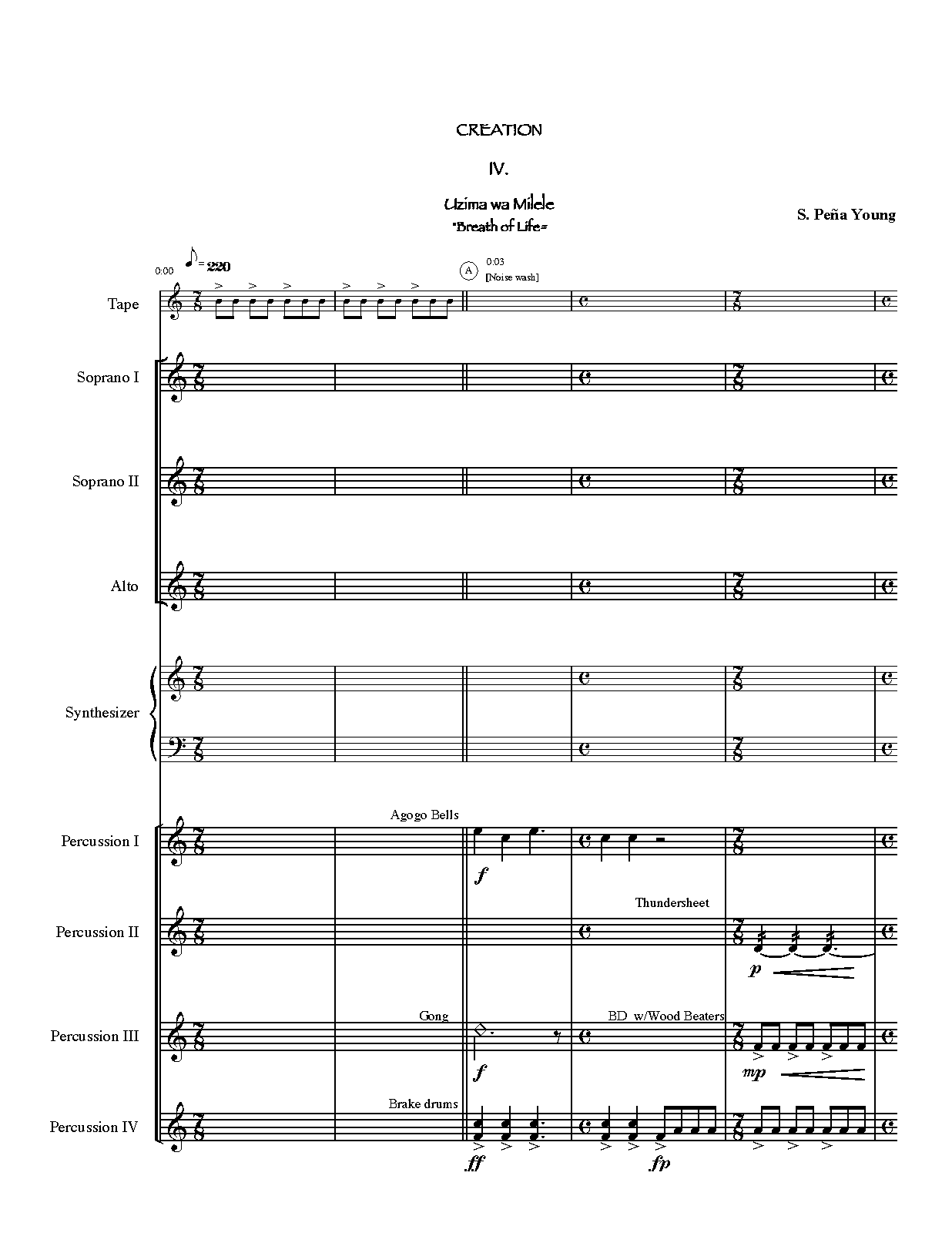 Performance Notes: The click tracks are mono click in the left ear and mono tape in the right ear. For performances, the click goes to the conductor headphones and the mono tape part goes to the house speakers.