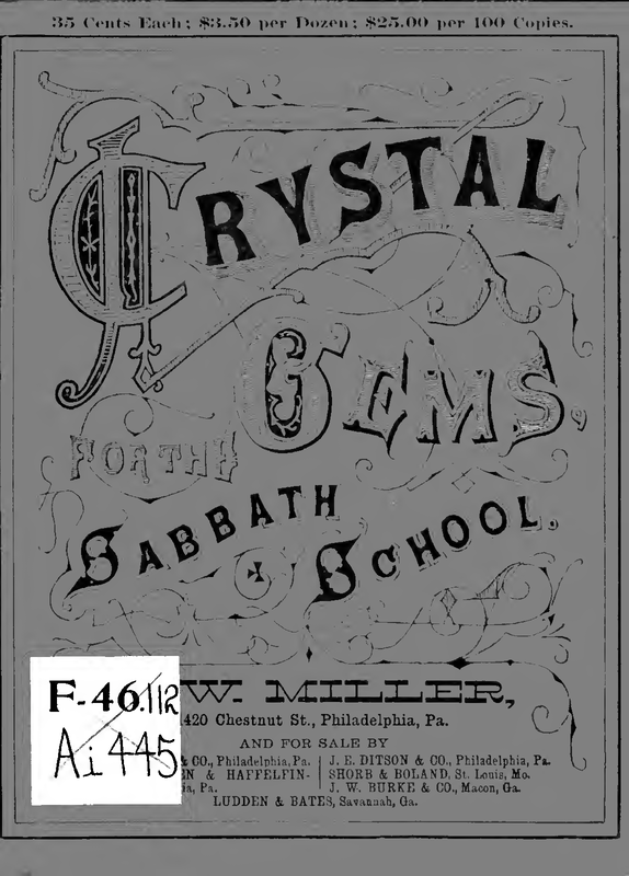 | Alternative. Title | Crystal Gems for the Sabbath School. Containing a choice collection of new hymns and tunes, suitable for anniversaries, and all other exercises of the Sabbath-School; together with a fine selection of hymns for prayer and Praise Meetings. In the Seven Character Notes. With a clear explanation of the first principles of musical science. By L.W. Aikin. |