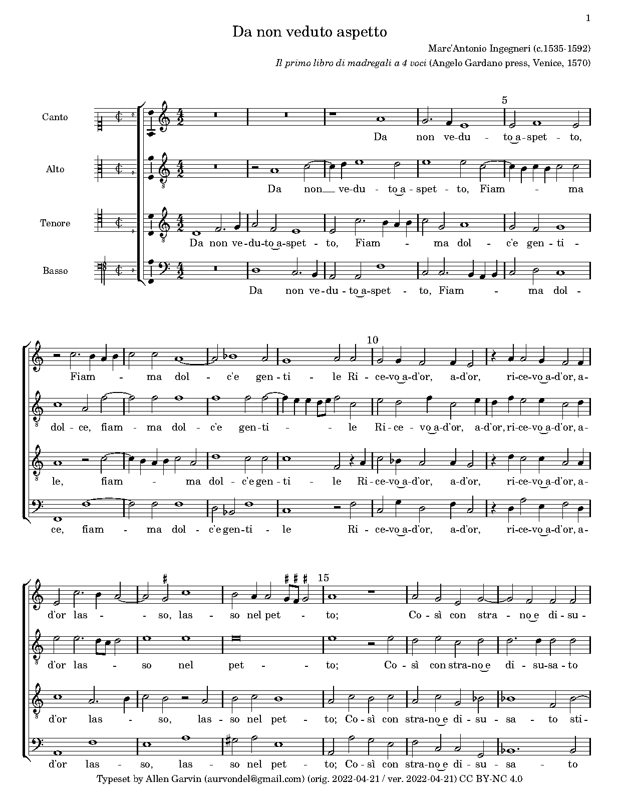 | First Publication | 1570 in Il primo libro de madrigale a 4 voci (Venice: Gardano press) |