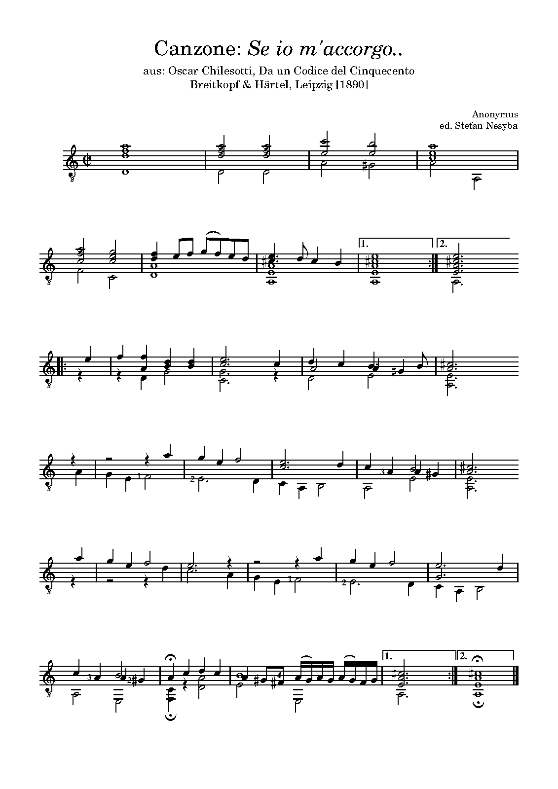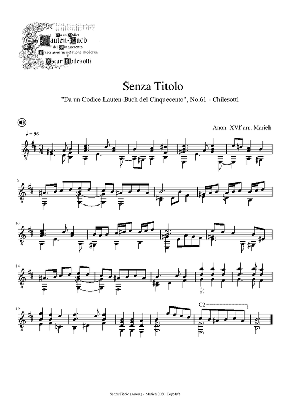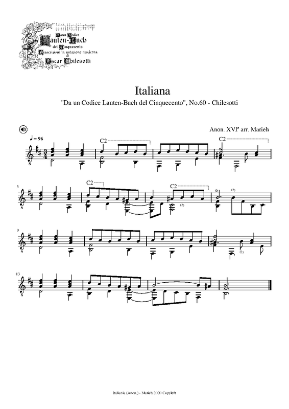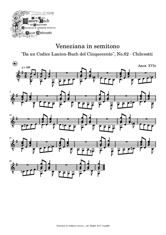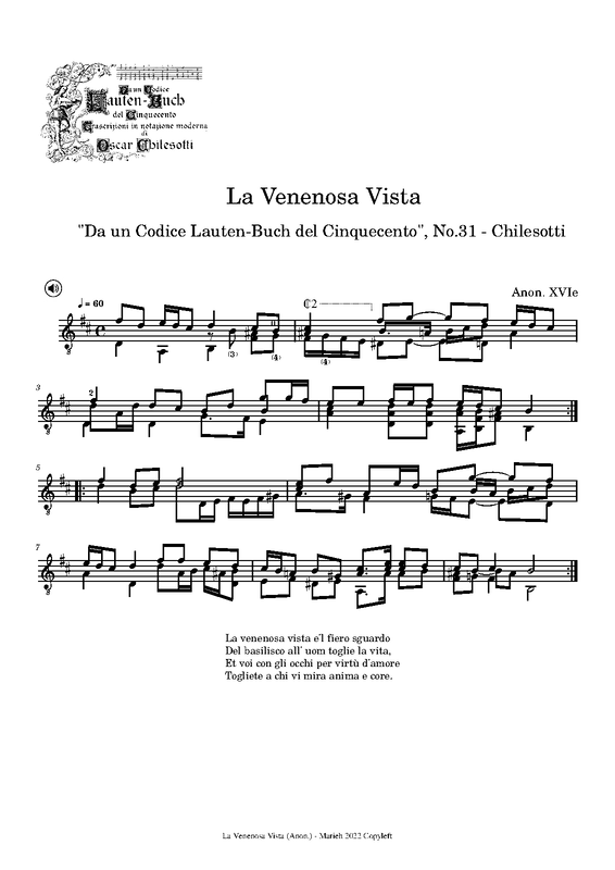 In the foreword Chilesotti wrote that he obtained a codex in which a german lute-player (he thought from the end of the 16th century) collected the most famous pieces of that time (italian lute-tablature). Several pieces therefrom Chilesotti transposed for the guitar.
