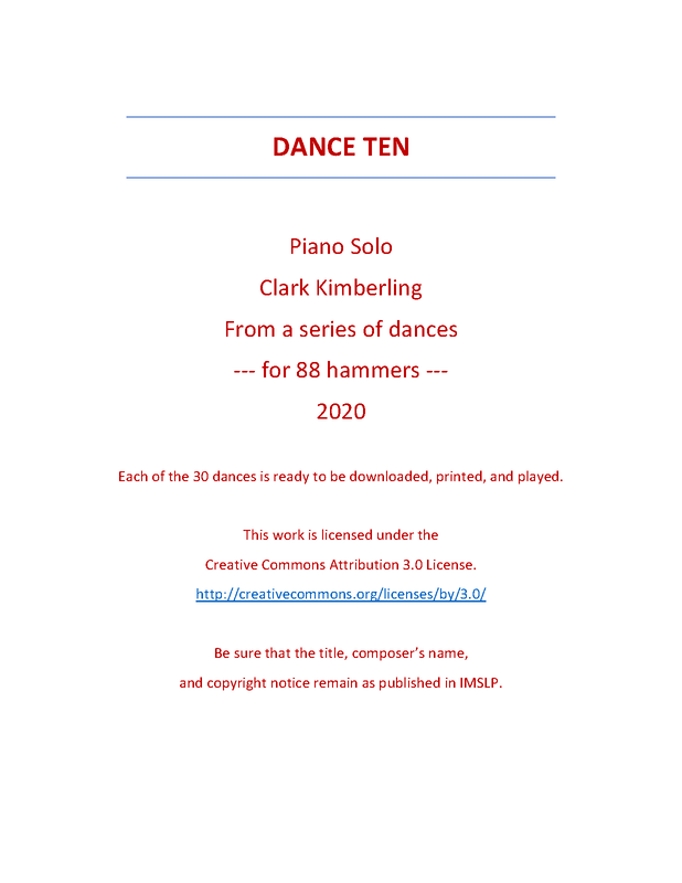 This is the tenth piano solo in a series of 30 dances (for the 88 hammers). The four pages are designed to be downloaded, printed, and played. The piece can be arranged and/or performed freely. Just be sure to keep composer's name and copyright notice as they appear here.