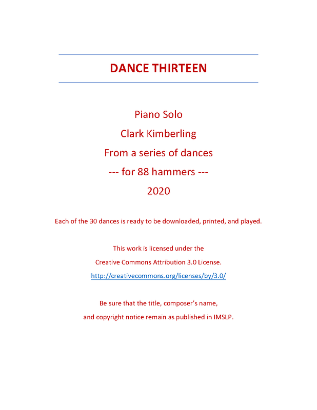 This is the thirteenth piano solo in a series of 30 dances (for the 88 hammers). The five pages are designed to be downloaded, printed, and played. The piece can be arranged and/or performed freely. Just be sure to keep composer's name and copyright notice as they appear here.