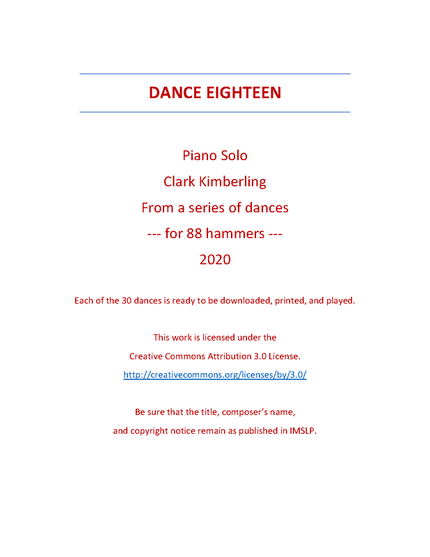 This is the eighteenth piano solo in a series of 30 dances (for the 88 hammers). The four pages are designed to be downloaded, printed, and played. The piece can be arranged and/or performed freely. Just be sure to keep composer's name and copyright notice as they appear here.