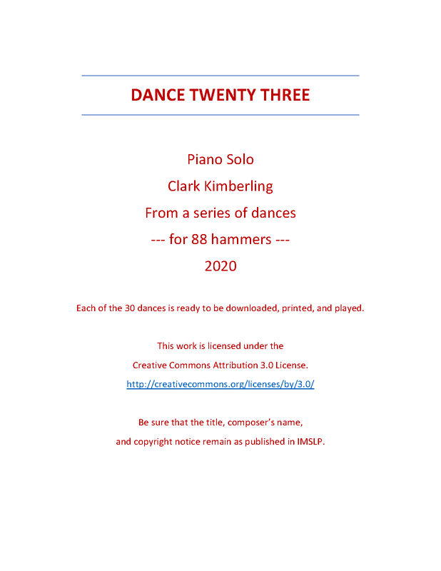 This is the twenty-third piano solo in a series of 30 dances (for the 88 hammers). The four pages are designed to be downloaded, printed, and played. The piece can be arranged and/or performed freely. Just be sure to keep composer's name and copyright notice as they appear here.
