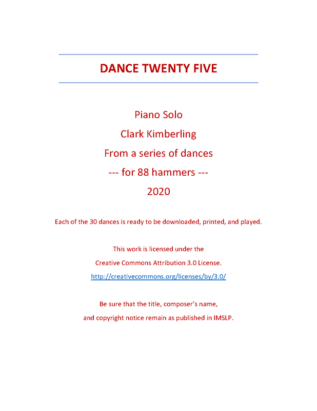 This is the twenty-fifth piano solo in a series of 30 dances (for the 88 hammers). The five pages are designed to be downloaded, printed, and played. The piece can be arranged and/or performed freely. Just be sure to keep composer's name and copyright notice as they appear here.