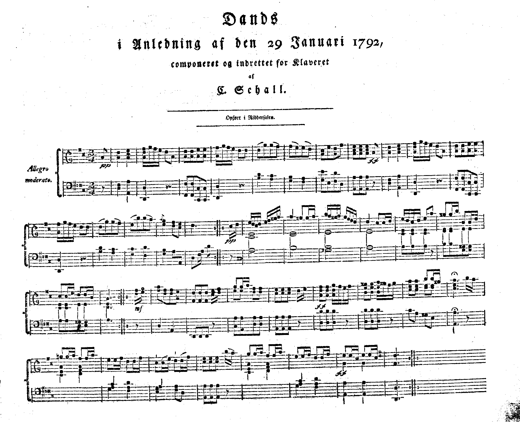 | Alternative. Title | Dands i Anledning af den 29 Januari 1792, componeret og indrettet for Klaveret af C. Schall : Opført i Riddersalen |