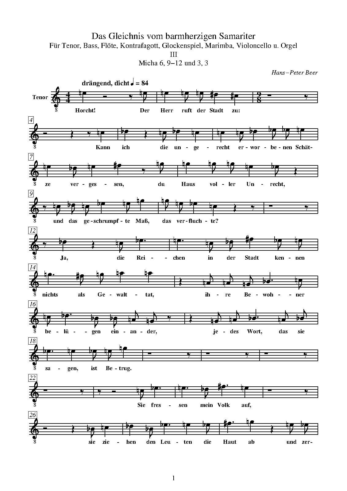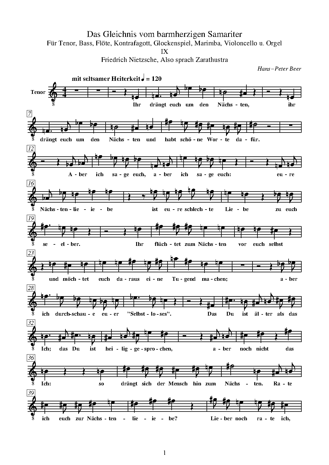 ⇒ 10 more: 2. Es ist dir gesagt worden, Mensch • 3. Horcht! Der Herr ruft der Stadt zu • 4. Niemand kann zwei Herren dienen • 5. Da stand ein Gesetzeslehrer auf • 6. Darauf antwortete ihm Jesus: • 7. Die Beschaffenheit des Glücks • 8. Auch ein Levit kam zu der Stelle • 9. Ihr drängt euch um den Nächsten • 10. Dann kam ein Mann aus Samarien • 11. Was meinst du: Wer von diesen dreien hat sich als der Nächste dessen erwiesen