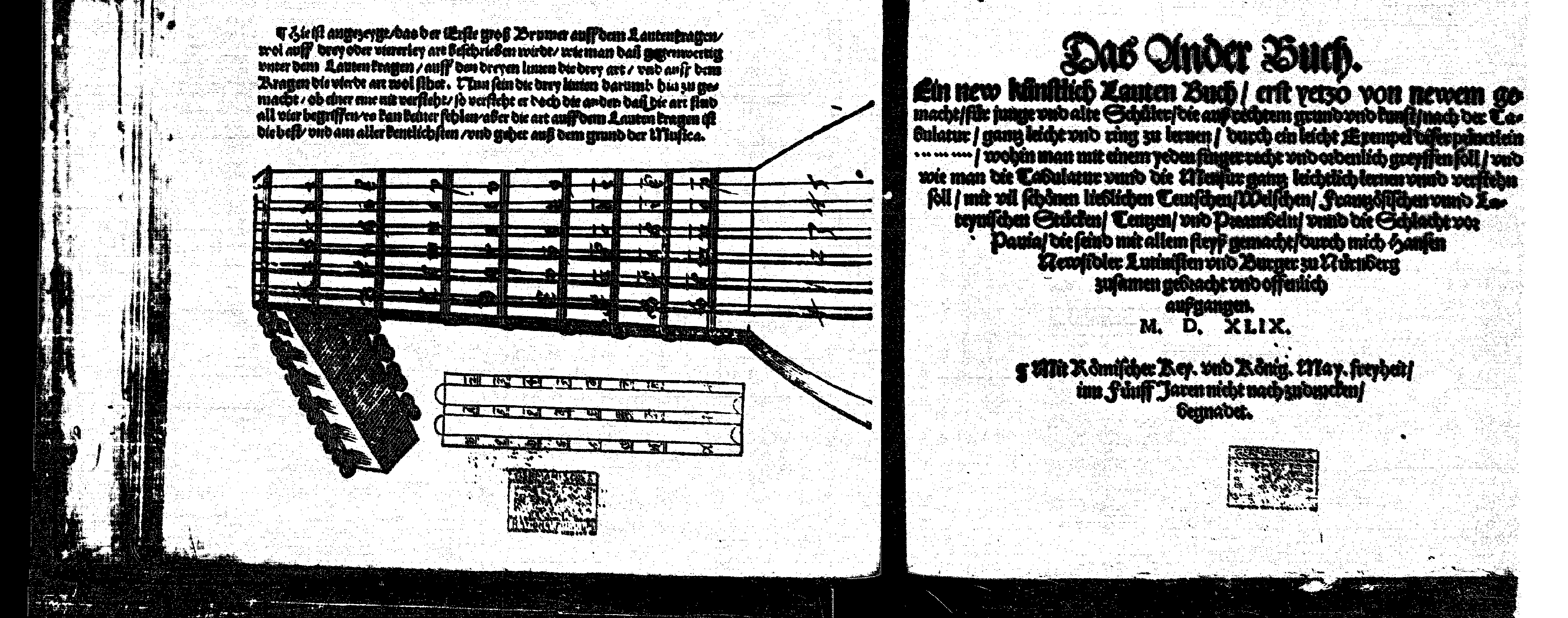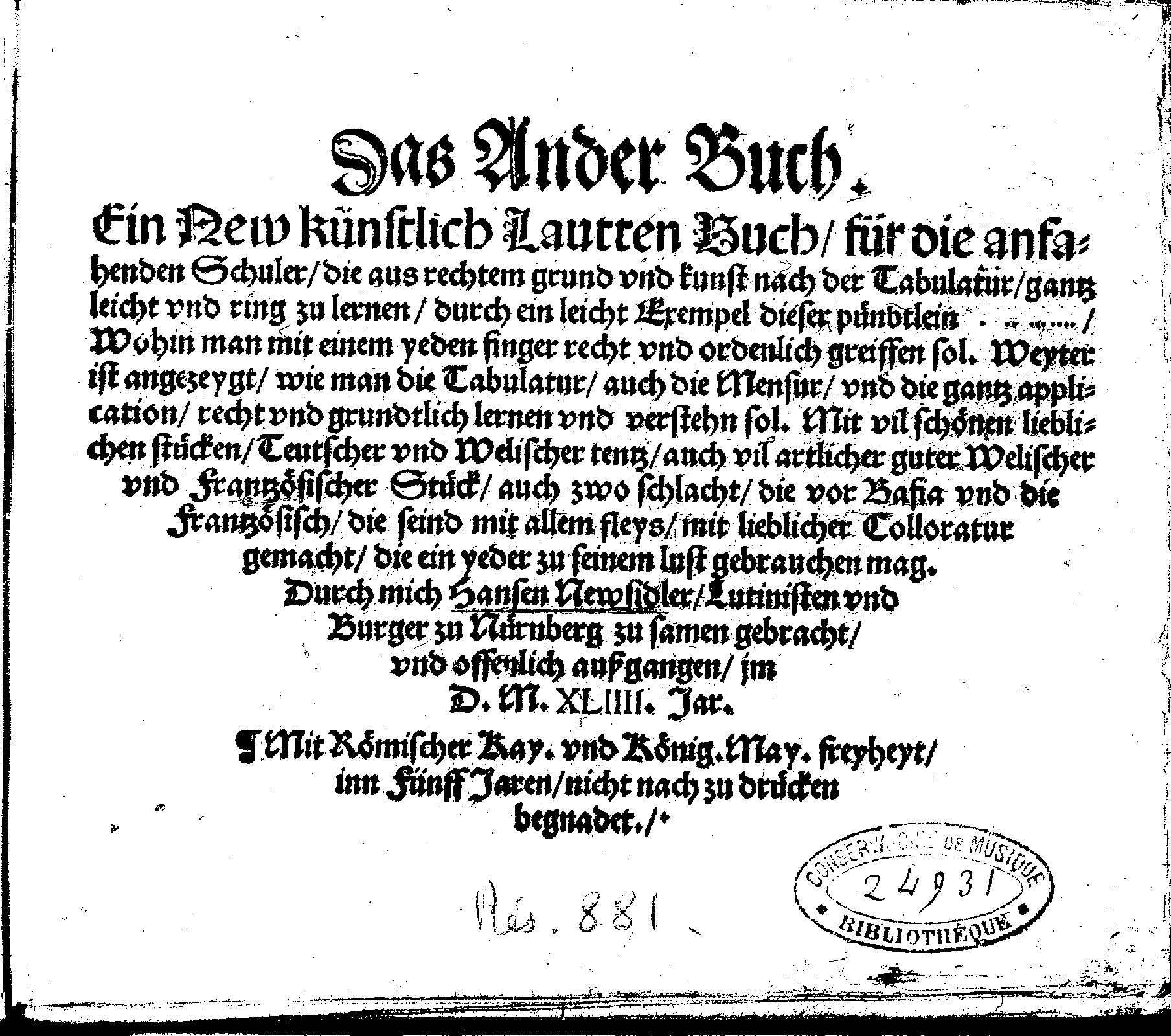 Das Ander Buch. Ein New künstlich Lautten Buch, für die anfahenden Schuler, die aus rechtem grund vnd kunst nach der Tabulatur, gantz leicht vnd ring zu lernen, durch ein leicht Exempel dieser pünctlein . .. ... .... , Wohin man mit einem yedem finger recht und ordenlich greiffen sol. Weyter ist angezeygt wie man die Tabulatur, auch die Mensur, vnd die gantz application, recht vnd grundtlich lernen vnd verstehn sol. Mit vil schönen lieblichen stücken, Teutscher vnd Welischer tentz, auch vil artlicher guter Welischer vnd Frantzösischer Stück, auch zwo schlacht, die vor Bafia vnd die frantzösisch, die seind mit allem fleys, mit lieblicher Colloratur gemacht, die ein yeder zu seinem lust gebrauchen mag. Durch mich Hansen Newsidler, Lutinisten vnd Burger zu Nürnberg zu samen gebracht vnd offenlich aussgangen, im DMXLIIII Jar.