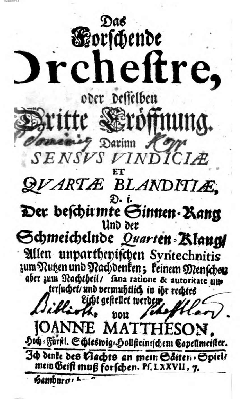 | Alternative. Title | Das Forschende Orchestre, oder desselben Dritte Eröffnung. Darinn sensus vindiciæ et quartæ blanditiæ, D. i. Der beschirmte Sinnen-Rang Und der Schmeichelnde Quarten-Klang, Allen unpartheyischen Syntechnitis zum Nutzen und Nachdenken; keinem Menschen aber zum Nachtheil, sana ratione & autoritate untersuchet, und vermuhtlich in ihr rechtes Licht gestellet werden von Joanne Mattheson ... |