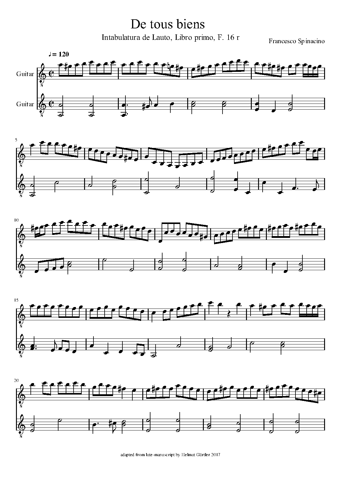 Extra Information Spinacino uses the tenor and bassus of the original for the "Tenor"- lute, the upper voice is a free composition
