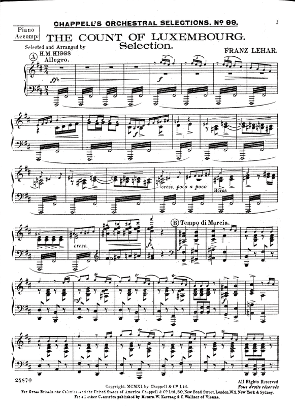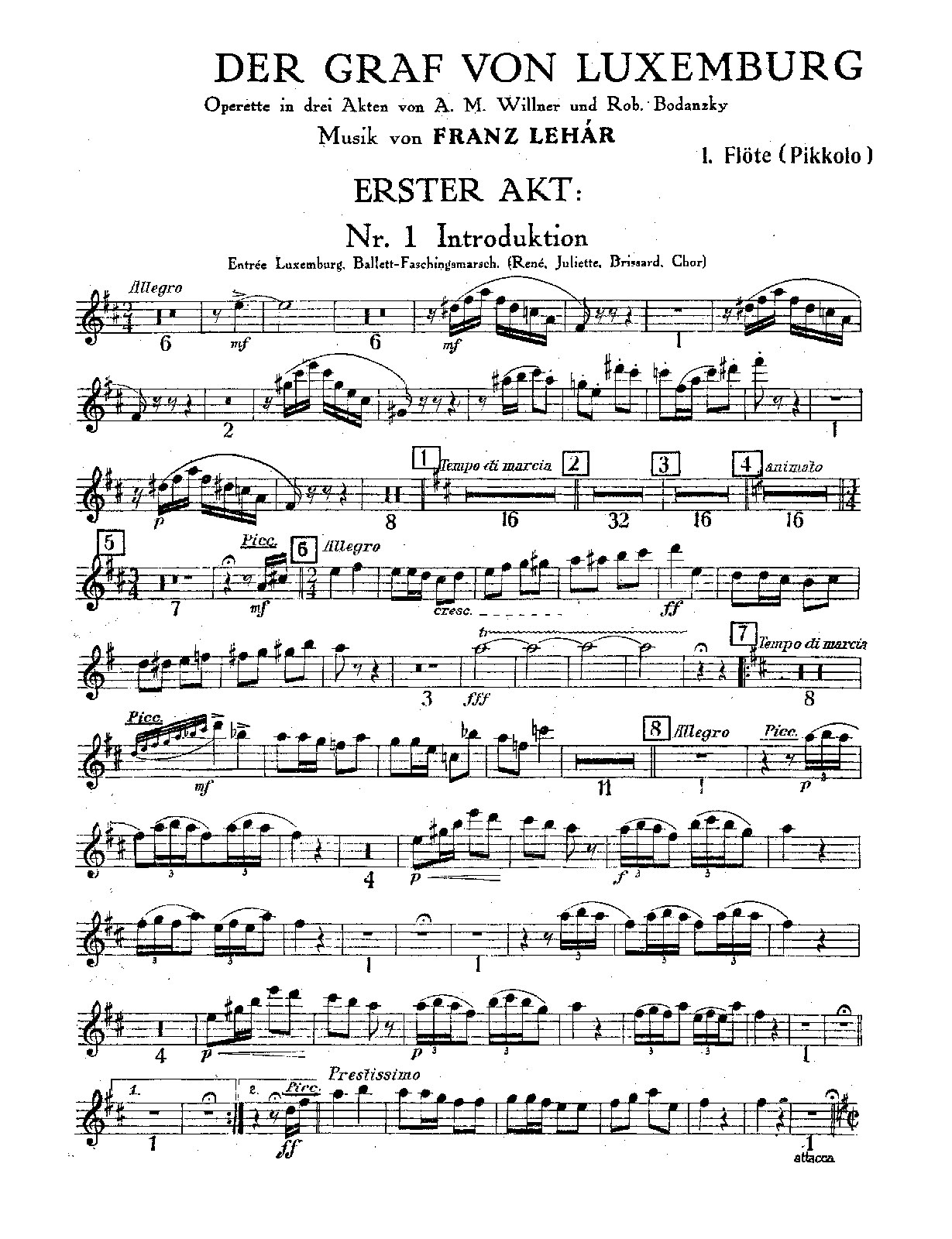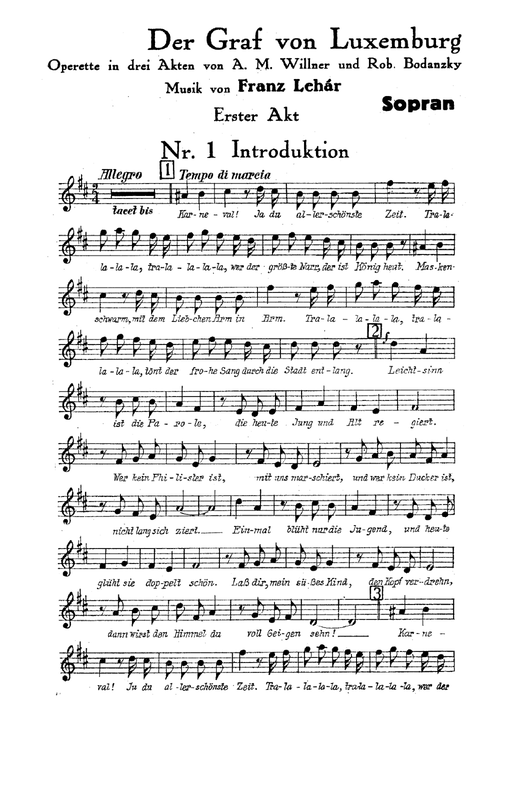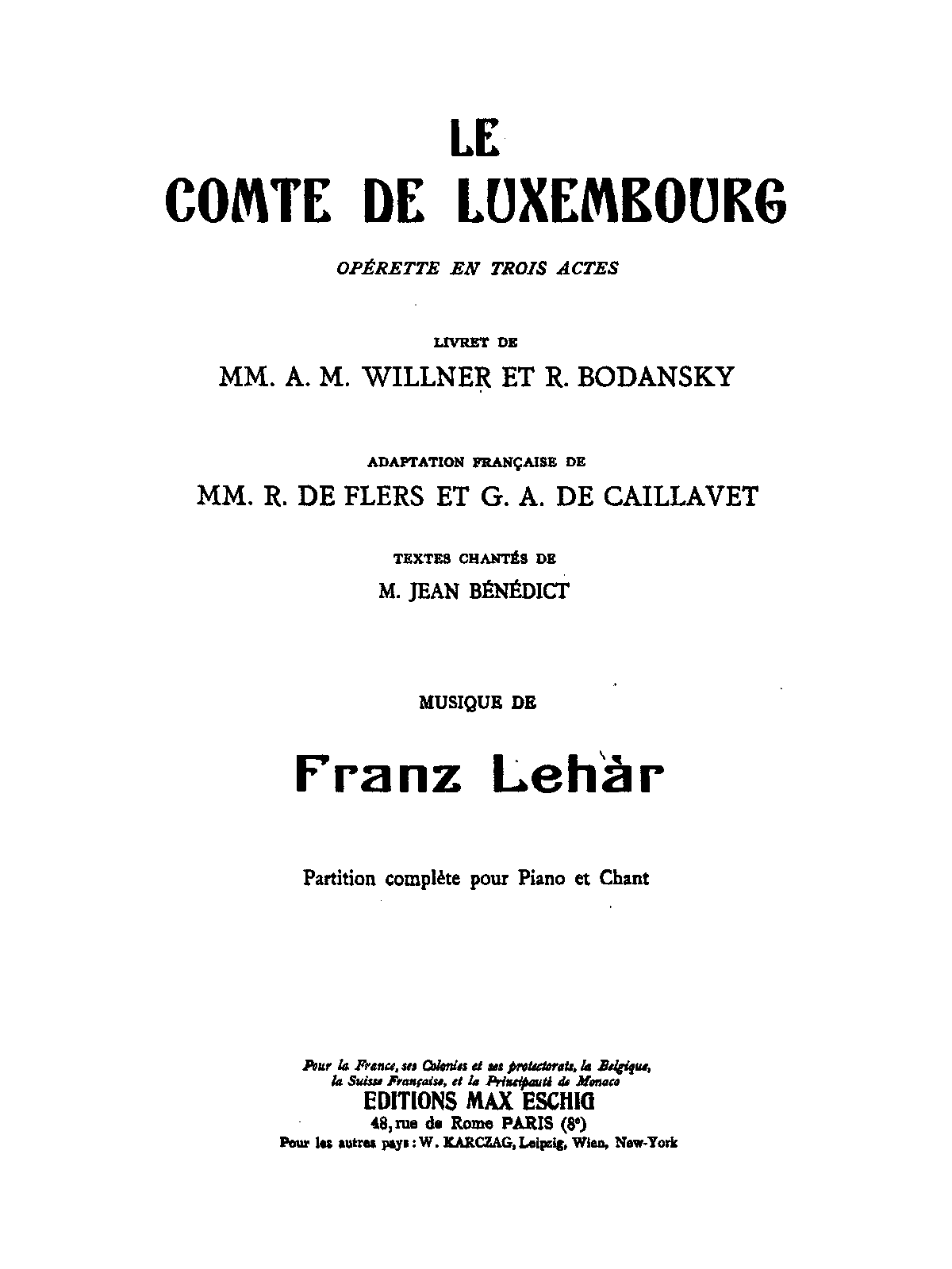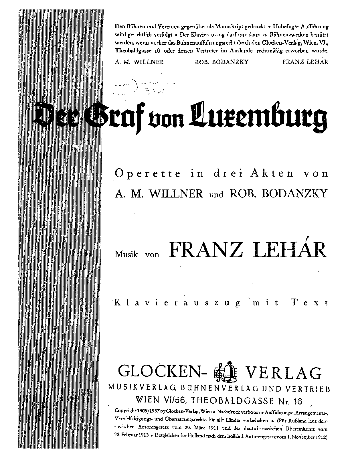 | First Performance. | 1909-11-12 in Vienna, Theater an der Wien (original version) 1911-05-20 in London, Daly's Theatre (The Count of Luxembourg) 1937-03-04 in Berlin, Theater des Volkes (revised version) |