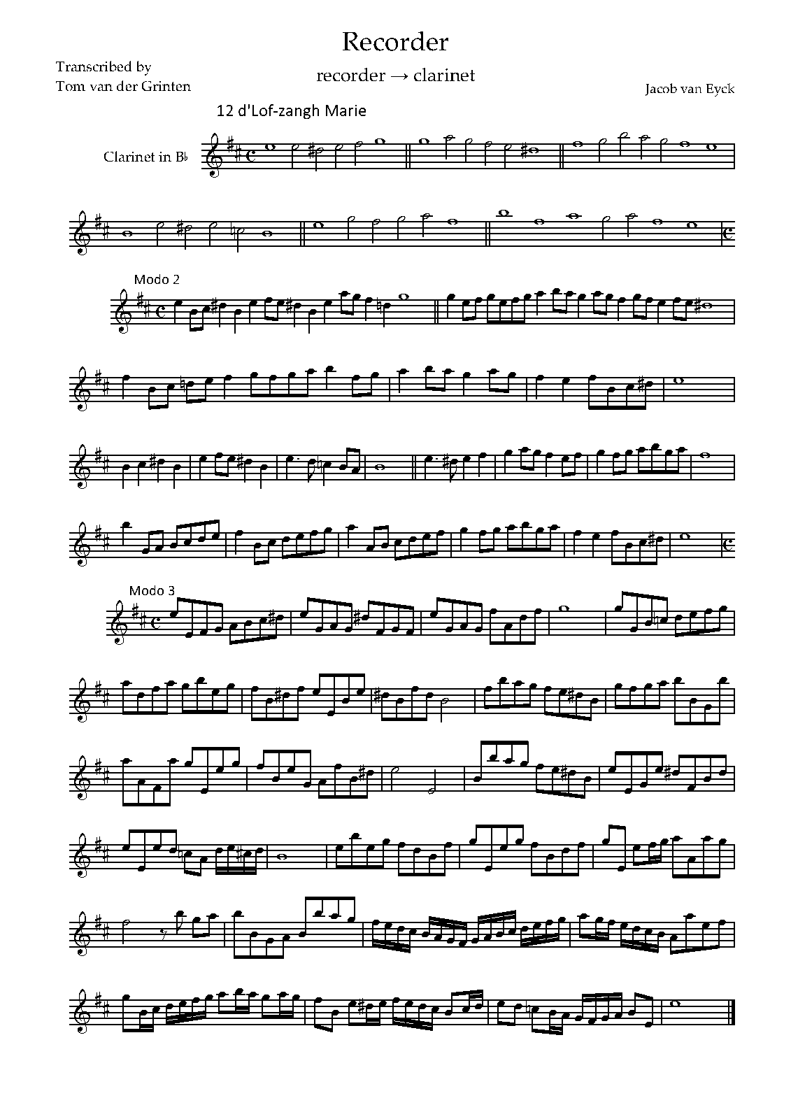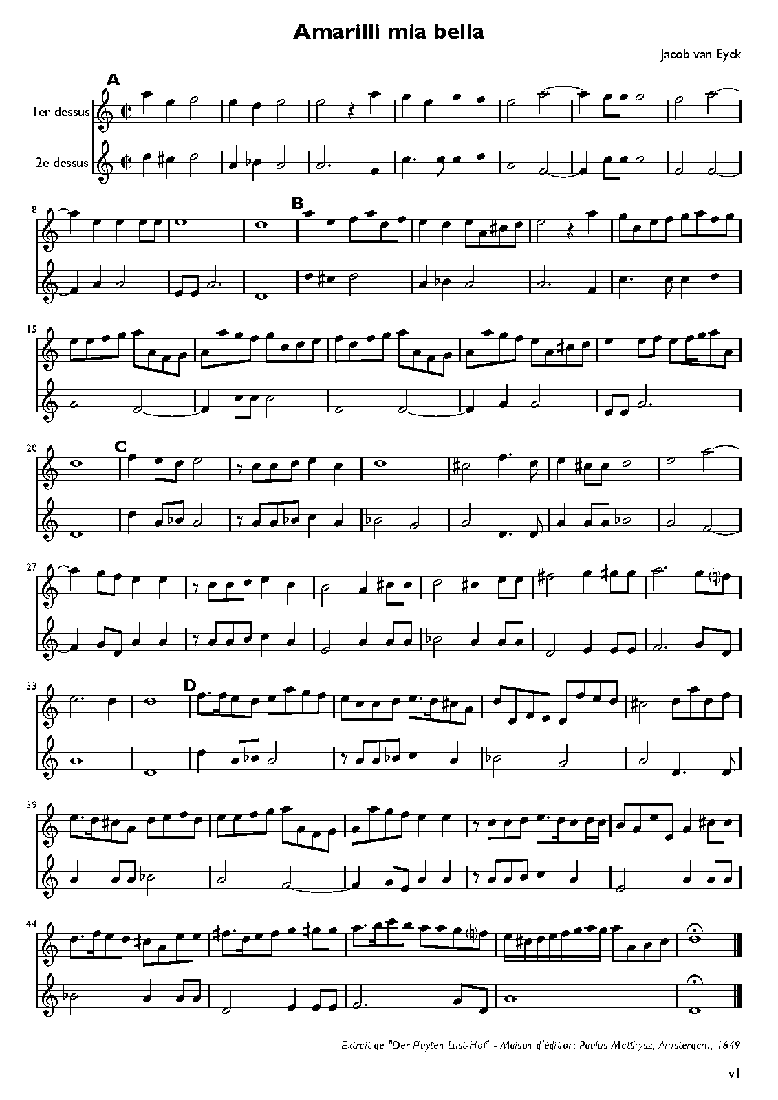- Der Fluyten Lust-Hof, Beplant met Psalmen, Pavanen, Almanden, Couranten, Balletten, Airs, &c. En de nieuste Voizen, konstigh en lieflyk gefigureert, met veel veranderingen. Door den Ed. Jr. Jacob van Eyck, Musicyn en Directeur van Klok-wercken tot Uitrecht, &c. Dienstigh, voor alle Konst-lievers tot de Fluit, Blaes en allerley Speel-tuigh. Tweede Deel.
