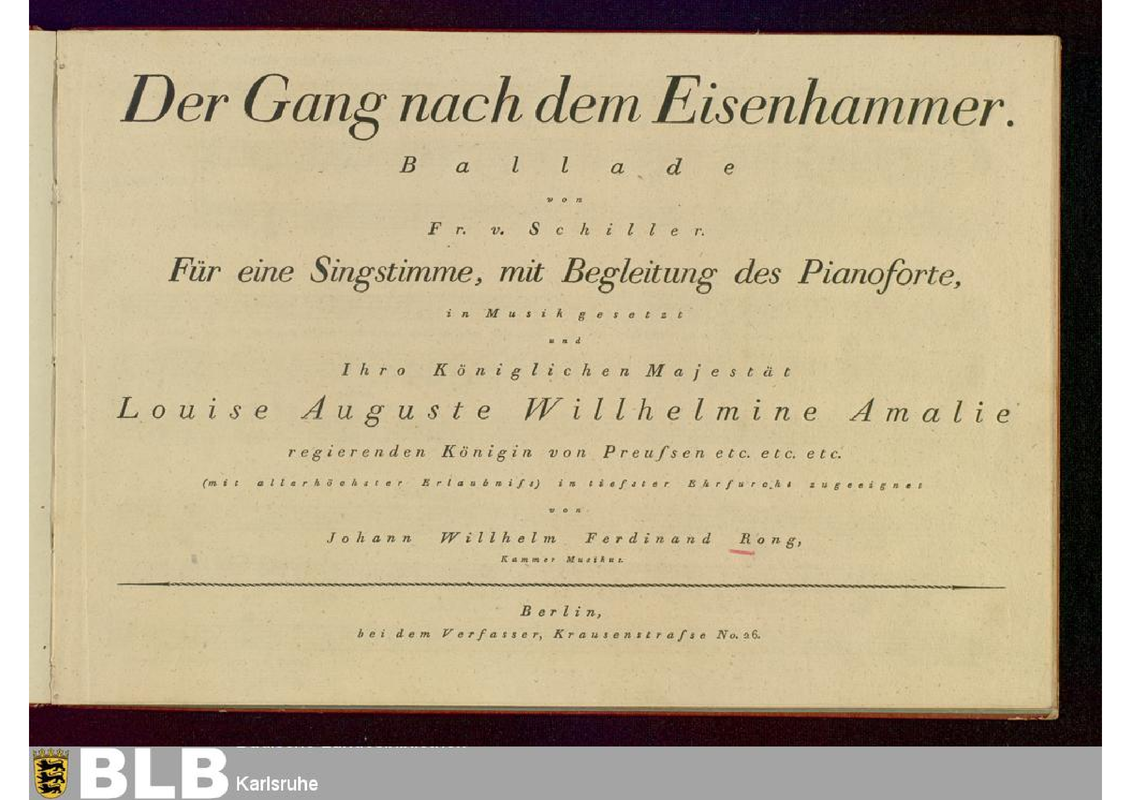 Der Gang nach dem Eisenhammer, Ballade von Fr. v. Schiller, für eine Singstimme mit Begleitung des Pianoforte, in Musik gesetzt ... von Johann Willhelm Ferdinand Rong