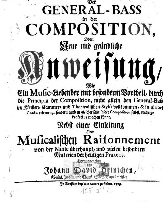 Der General-Bass in der Composition, Oder: Neue und gründliche Anweisung, Wie ein Music-Liebender mit besonderm Vortheil, durch die Principia der Composition, nicht allein den General-Bass im Kirchen- Cammer- und Theatralischen Stylô vollkommen, & in altiori Gradu erlernen; sondern auch zu gleicher Zeit in der Composition selbst, wichtige Profectus machen könne. Nebst einer Einleitung Oder Musicalischen Raisonnement von der Music überhaupt, und vielen besondern Materien der heutigen Praxeos. Herausgegeben von Johann David Heinichen