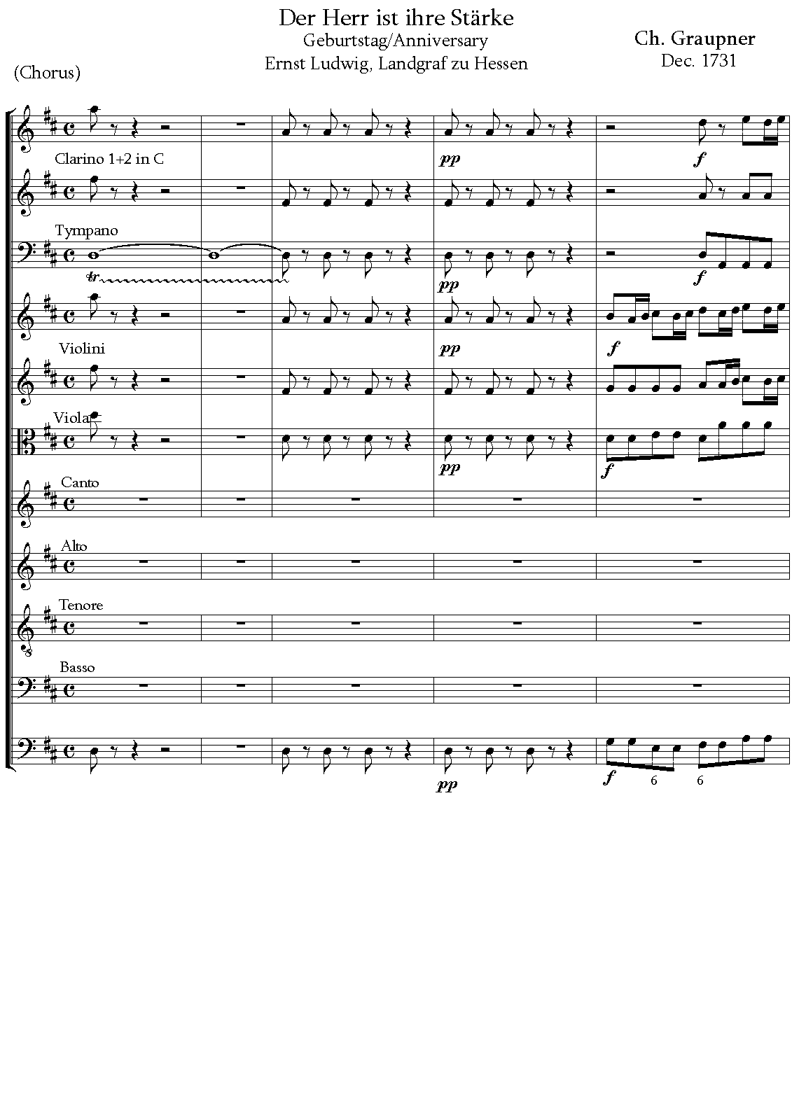 | Instrumentation | Voices: soprano, alto, tenor, bass Orchestra: 2 flutes, 2 trumpets, timpani, 2 violins sordino, strings, continuo |