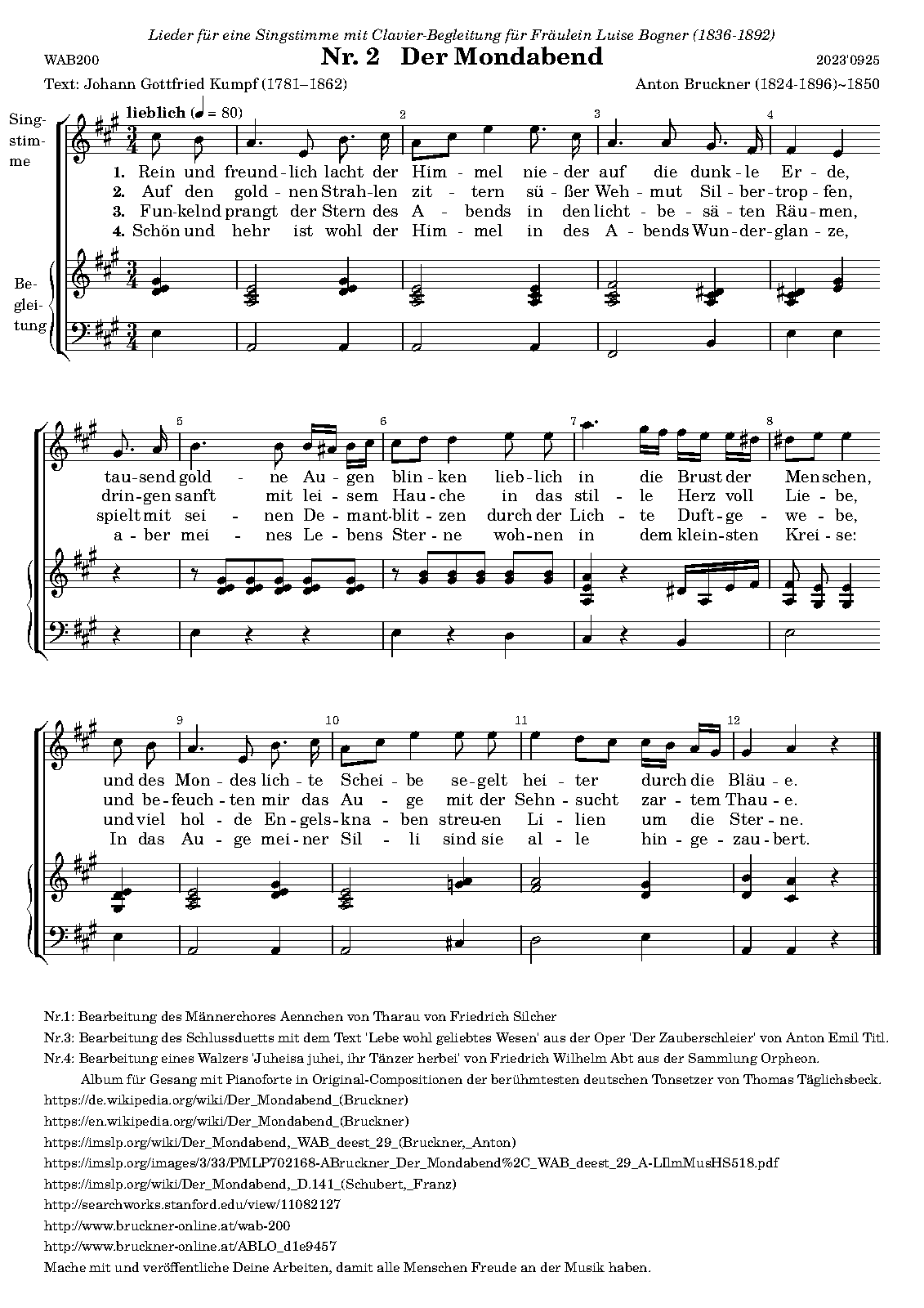 | Extra Information | The key (A major), the meter (3/4) and the first four notes of the lied are the same as that of Franz Schubert's "Der Mondabend", a lied that Aloisia Bogner liked very much. |