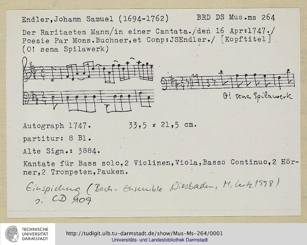 | Instrumentation | Bass voice + 2 horns, 2 trumpets, timpani, strings, basso continuo |