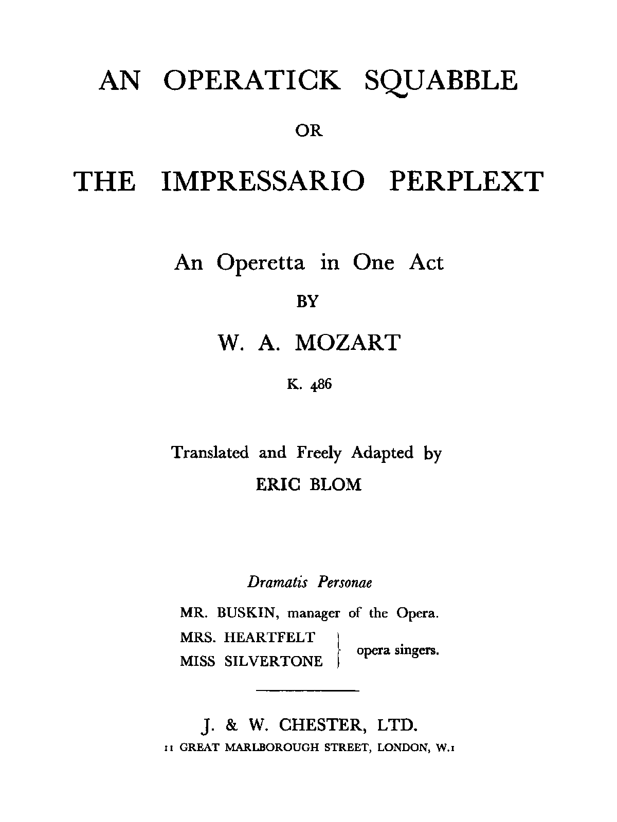Name Aliases Le Directeur de théâtre; O Empresário Teatral; Der schauspieldirektor; L'Impresario Teatrale; Schauspieldirektor; Teaterdirektören K. 486; KV 486; El empresario teatral; Divadelní ředitel; K. 486