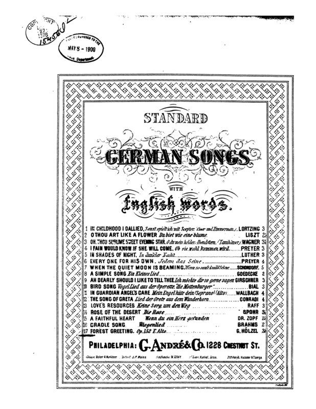Standard German Songs with English Words, No.17 Philadelphia: G. André & Co., 1876. Plate G.A. & Co. 398.
