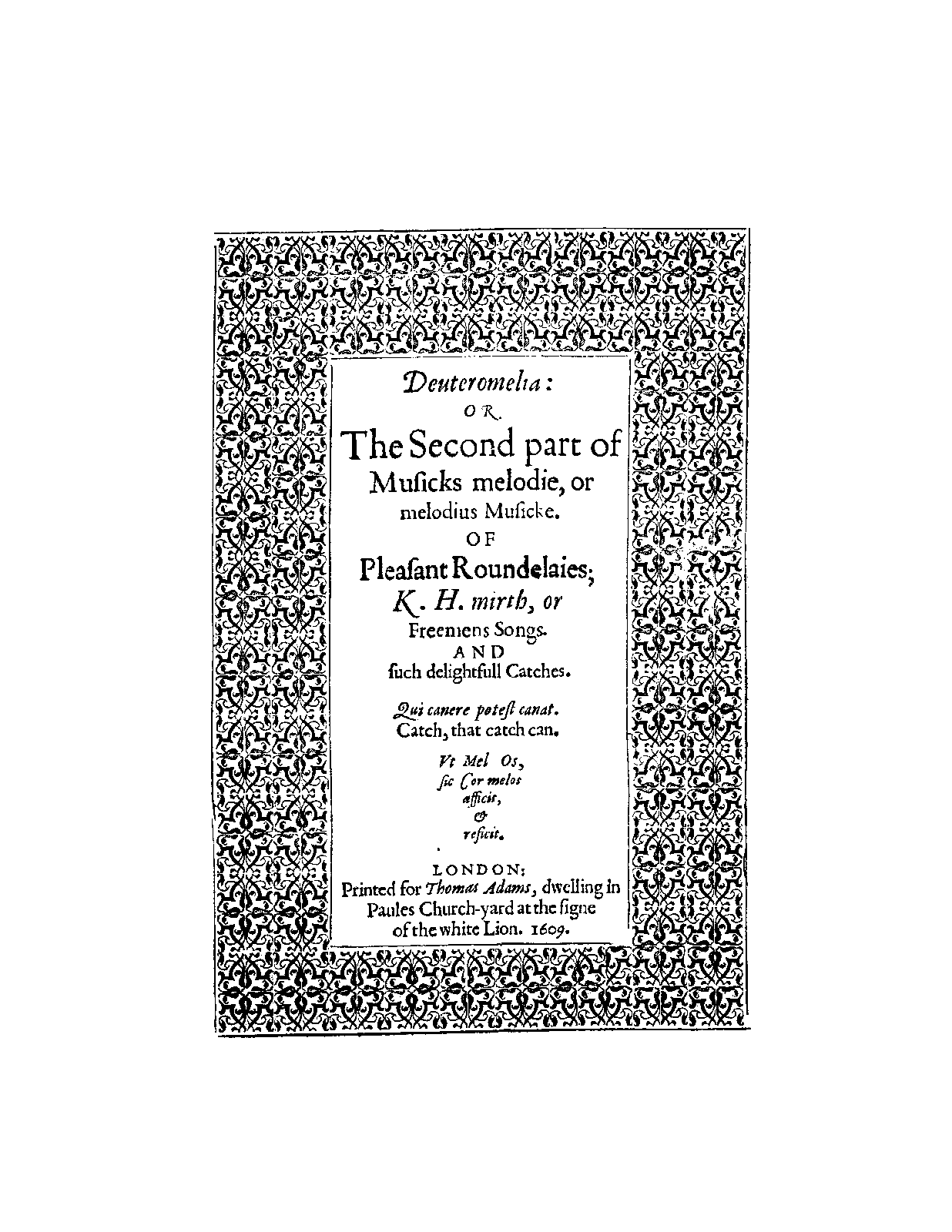 | Alternative. Title | Deuteromelia, or, the Second Part of Musicks melodie, or melodius Musicke, of Pleasant Roundelaies; K. H. mirth, or Freemens Songs, and such delightfull Catches |