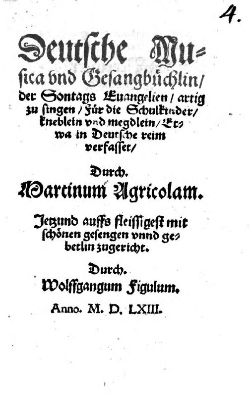 Deutsche Musica vnd Gesangbüchlin, der Sontags Euangelien, artig zu singen, fuer die Schulkinder, kneblin und megdlin, etwa in Deutsche reim verfasset