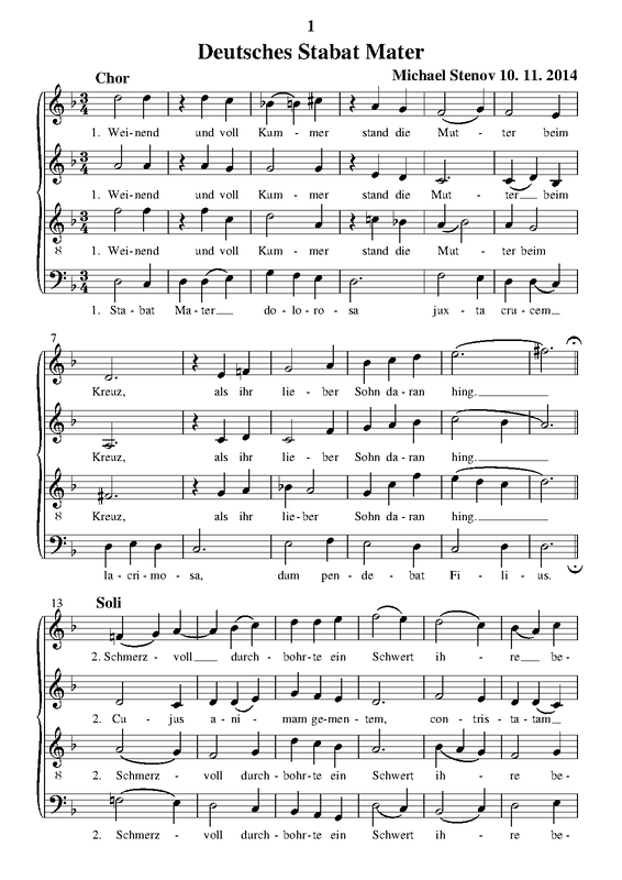| Extra Information | All 20 movements contain the Gregorian Stabat Mater in one voice, the other 3 voices sing the German text with equal meaning. |
