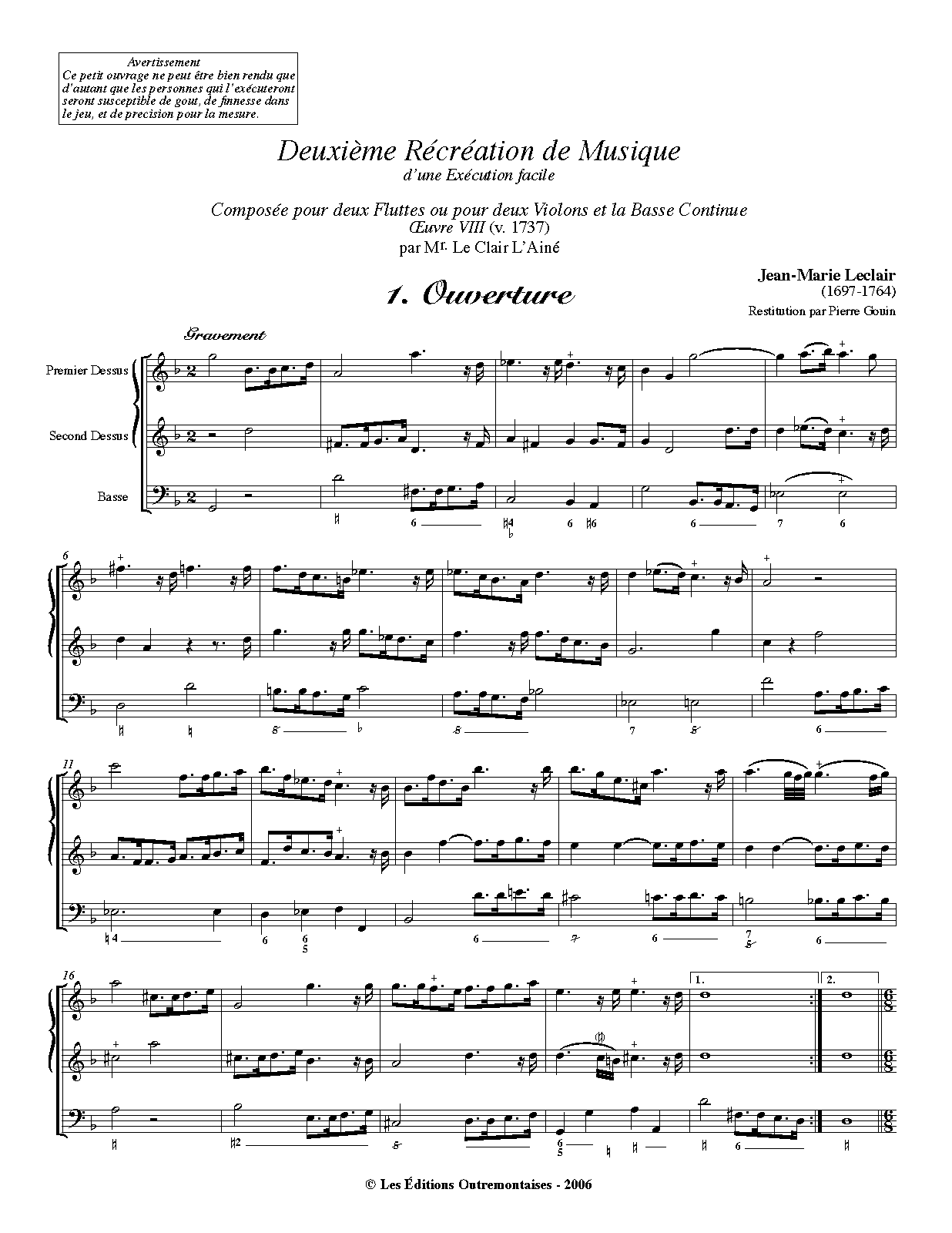 | Alternative. Title | Deuxième Récréation de musique d'une Exécution facile composée pour deux fluttes ou pour deux violons et la basse continue. |