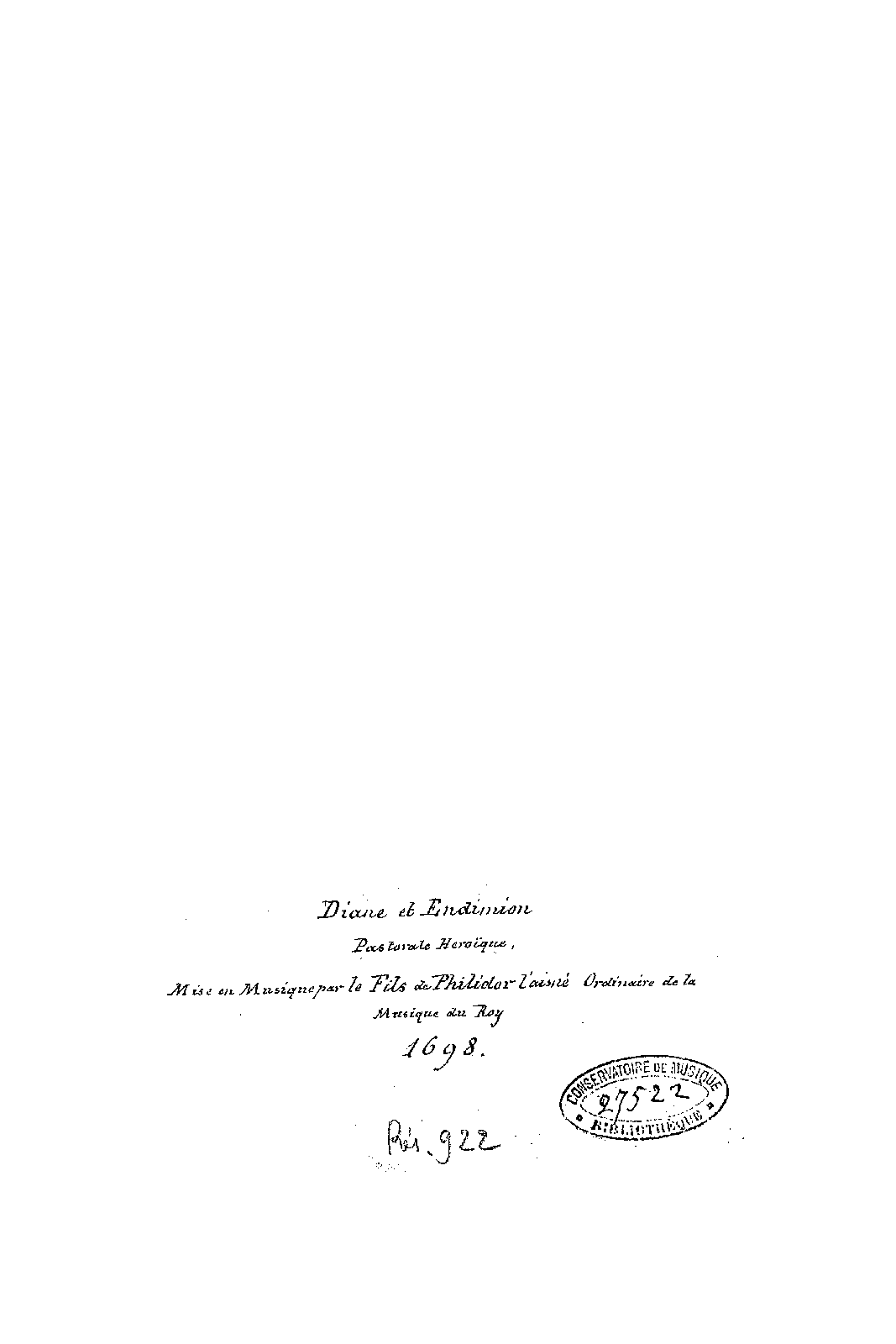Rôles : Pomone (Sol 2), Vertume (Ut 3), une Nymphe (Sol 2), Mars (Fa 4), Endymion (Ut 4), Diane (Sol 2), Melisse (Sol 2), Arcas (Fa 4), un Chasseur (Ut 3), Amarillis (Sol 2), Climeine (Sol 2), Alcidon (Fa 4). - Choeurs réduits : Sol 2 (2), Ut 3 ; Sol 2, Fa 4. - Orchestre réduit : Sol 1, Fa 4. - Mentions d'instrumentation sous la musique : viollons, flustes allemandes, hautbois, basson.