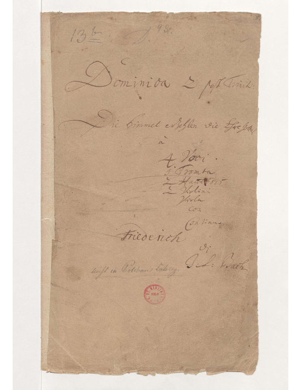 Misc. Notes Staatsbibliothek zu Berlin (D-B): Mus. ms. Bach St 13b. Complete Vocal parts, two Sopranos in Ripieno and 1 Alto in Ripieno part, Violin II part, Viola part, 2 Viola da Gamba parts.