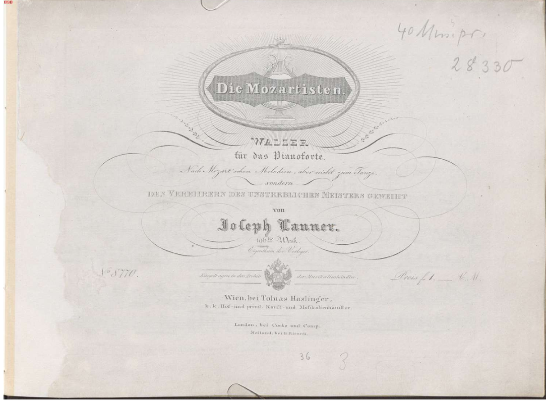 | Alternative. Title | Die Mozartisten. Walzer fuer das Pianoforte. Nach Mozart'schen Melodien, aber nicht zum Tanze ... geweiht |
