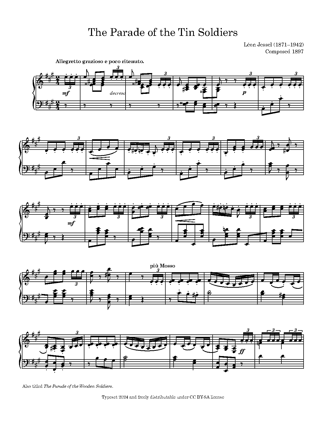 | Extra Information | Marche des petits soldats de plomb Op.14 no 6 by Pierné, (1886) is a similarly titled work. This piece was used as the theme music for the BBC children's radio series Toytown (1929-1980) |