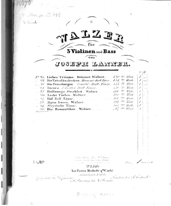 Walzer fur 3 Violinen und Bass von Joseph Lanner. No.30. Vienna: Pietro Mechetti qm Carlo, n.d.[1841]. Plate 3468, 3469.