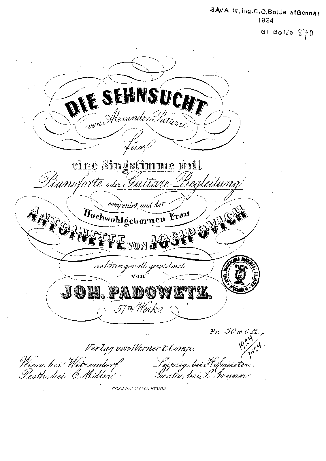 | Dedication | der Hochwohlgebornen Frau Antoinette von Josipovich achtungsvoll gewidmet |