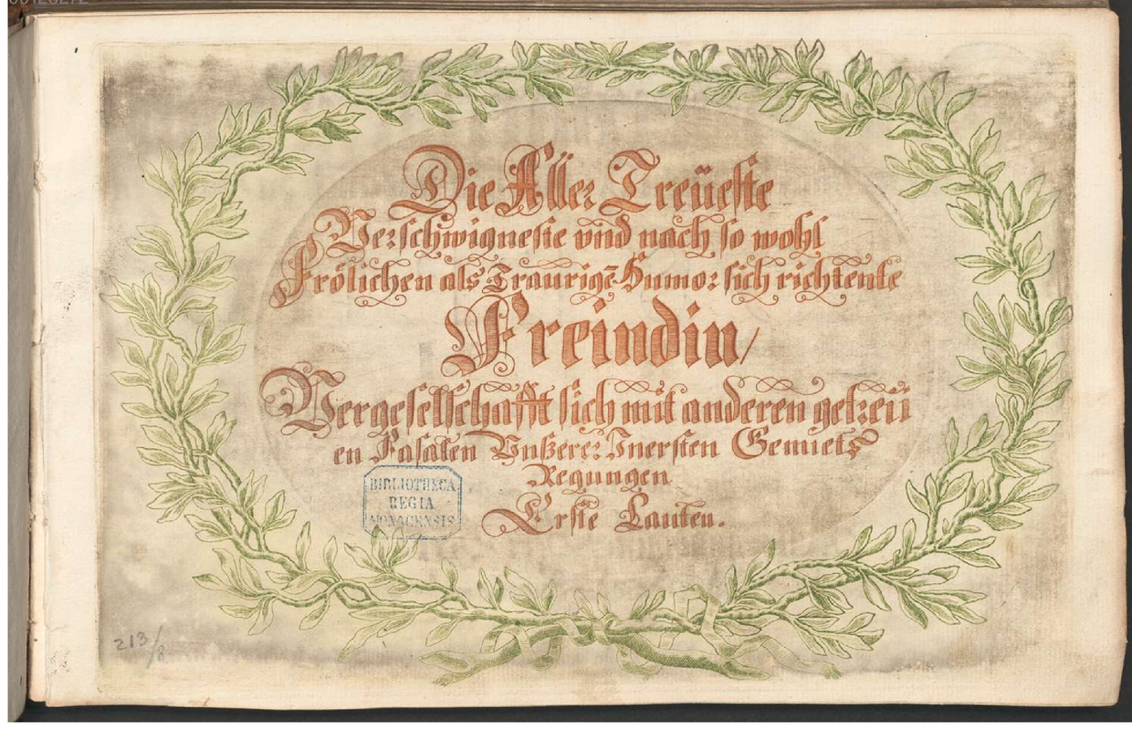 | Alternative. Title | Die Aller Treüeste, Verschwigneste und nach so wohl Fröhlichen als Traurigen Humor sich richtente Freindin, Vergesellschafft sich mit anderen getreiien Fasalen Unßerer Inersten Gemiets Regungen Erste Lauten Zu Ihren Affecten mit helffente Gesßillinen. Anderte und Drite Lauten Anderte und Drite Geigen, oder Viola Di Gamba Wahre Grund Vestung und Fundament. Der Paß. |