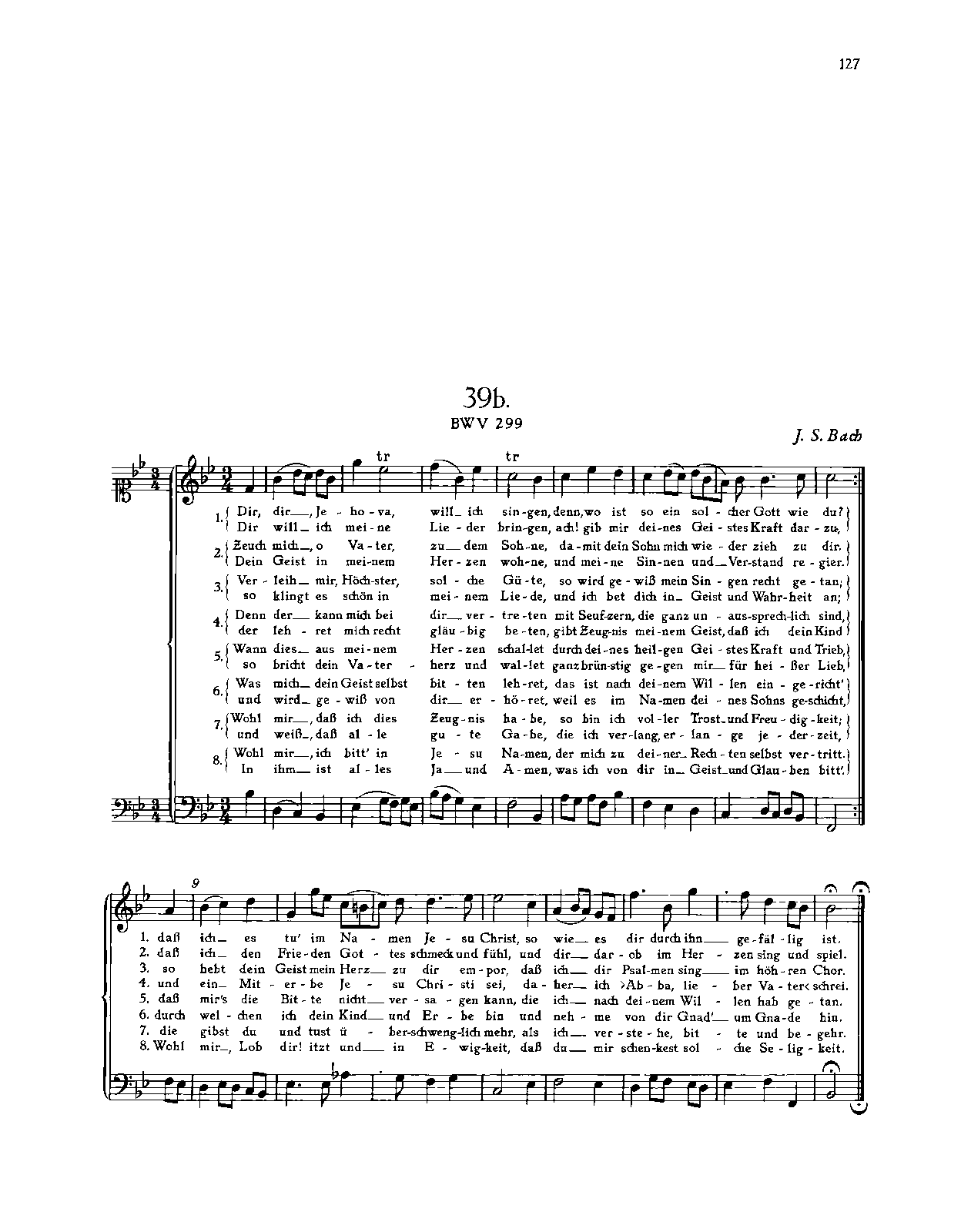 Misc. Notes 600 dpi. Page size is 10.00 x 12.688 inches. Included in the 1725 notebook of the Notebooks for Anna Magdalena Bach (No.39b). Uses Soprano and Bass lines from 4 part chorale of BWV 299 (see link below to workpage) but uses full 8 part text stanza version of this work. The Bass Line could be supplemented as well to play on Continuo with Voice on top to match the original version of this work.