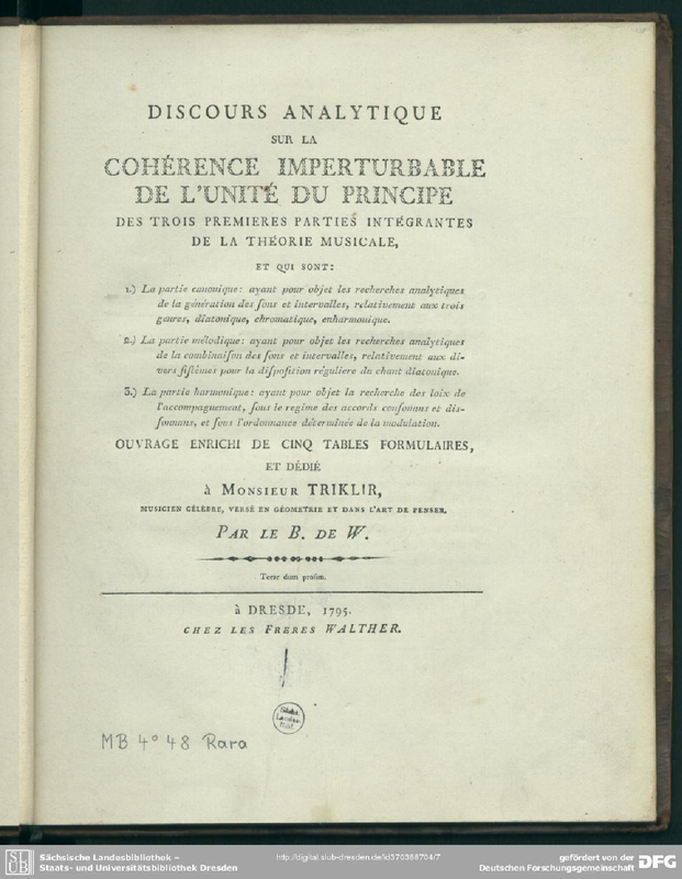 Discours Analytique sur la Cohérence Imperturbable de l'unité du principe des trois premieres parties integrantes de la théorie musicale, et qui sont: 1. La partie canonique: ayant pour objet les recherches analytiques de la génération des sons et intervalles, relativement aux trois genres, diatonique, chromatique, enharmonique. 2. La partie mélodique: ayant pour objet les recherches analytiques de la combinaison des sons et intervalles, relativement aux divers sistèmes pour la disposition réguliere du chant diatonique. 3. La partie harmonique: ayant pour objet la recherche des loix de l'accompagnement, sous le regime des accords consonans et dissonans, et sous l'ordonnance déterminée de la modulation. Ouvrage enrichi de cinq tables formulaires