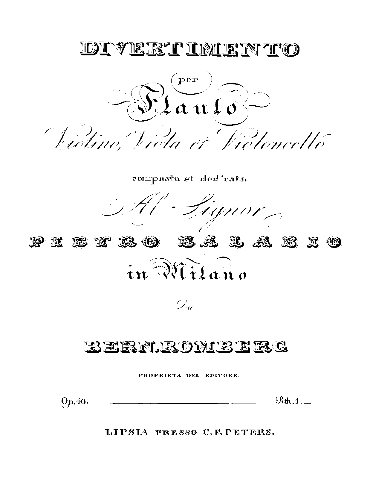 | Genre Categories | Divertimentos; For flute, violin, viola, cello; Scores featuring the flute; |