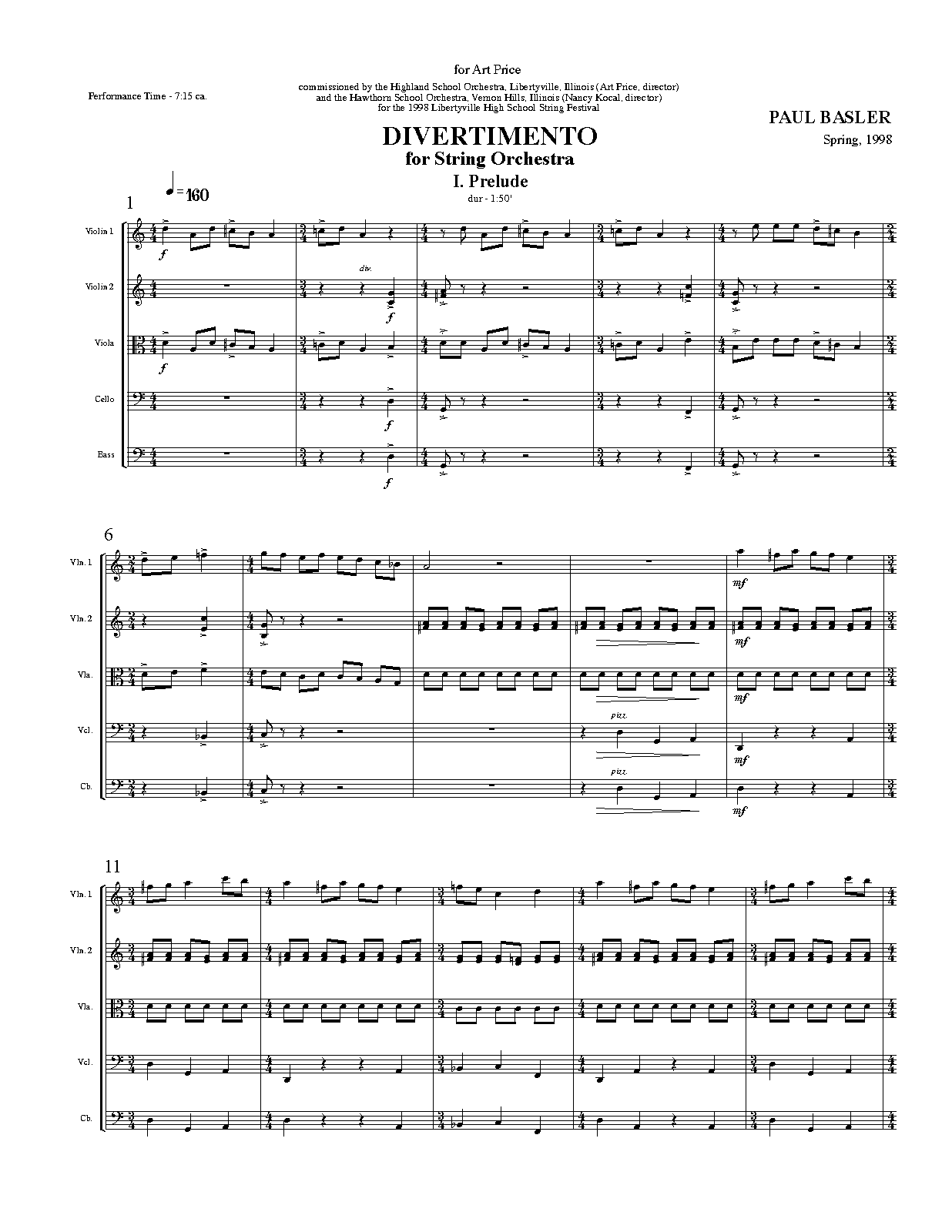 | Dedication | For Art Price, commissioned by the Highland School Orchestra, Libertyville, Illinois (Art Price, director) and the Hawthorn School Orchestra, Vernon Hills, Illinois (Nancy Kocal, director) for the 1998 Libertyville High School String Festival |