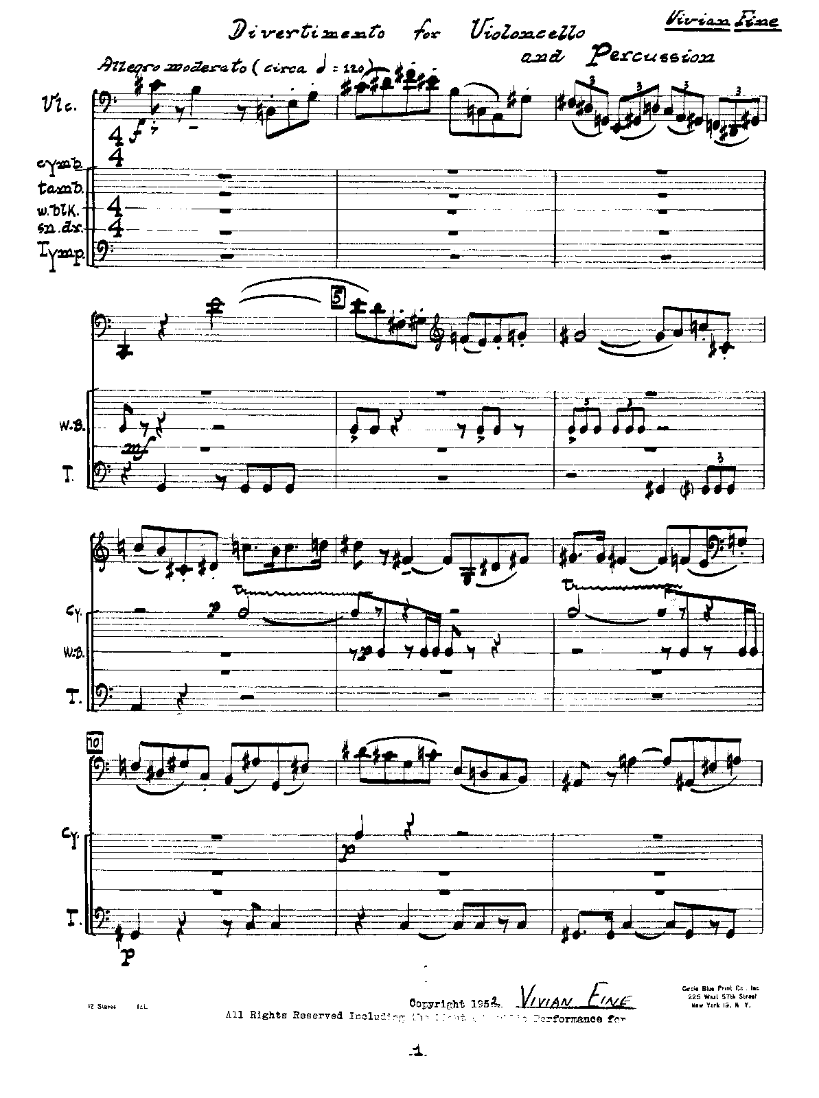 The Divertimento divides into four sections forming a loose ABA pattern. The A material is an active cello melody displaying Fine’s penchant for writing a well-articulated but tonally free line. The percussion is heard as an accompaniment. The B sections place more emphasis on the percussion, sometimes creating duets between the ensemble and cello or isolating individual colors, such as timpani and cello.
