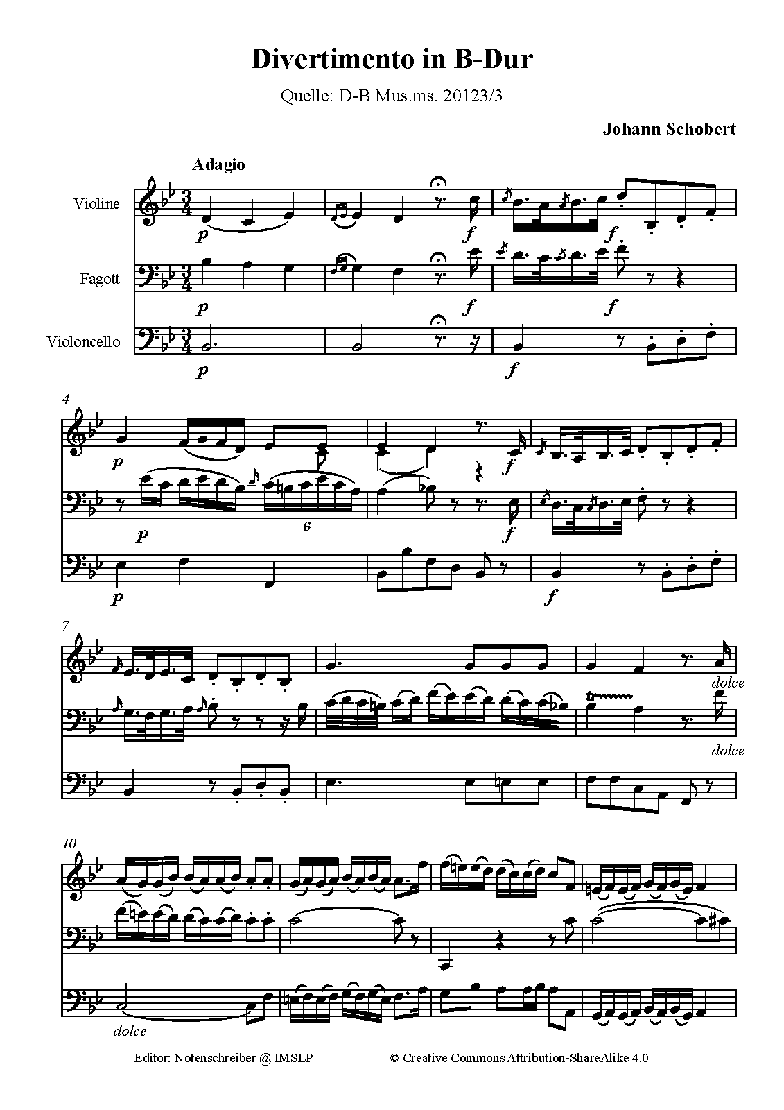 | Genre Categories | Divertimentos; For bassoon, violin, cello; Scores featuring the bassoon; |