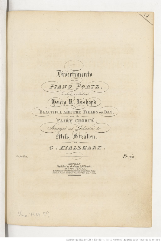 | Alternative. Title | Divertimento for the Piano Forte, In which is introduced Henry R. Bishop's Beautiful are the Fields of Day, and the Fairy Chorus [from 'Aladdin'], Arranged ... by G. Kiallmark |