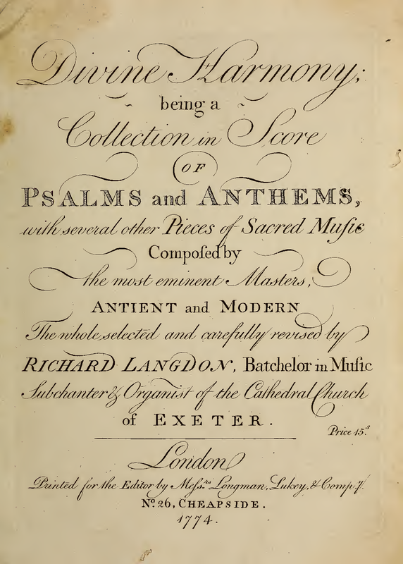 Divine Harmony; being a Collection in Score of Psalms and Anthems, with several other Pieces of Sacred Music composed by the most eminent Masters, Antient and Modern, the whole selected and carefully revised by Richard Langdon, Batchelor in Music, Subchanter & Organist of the Cathedral Church of Exeter