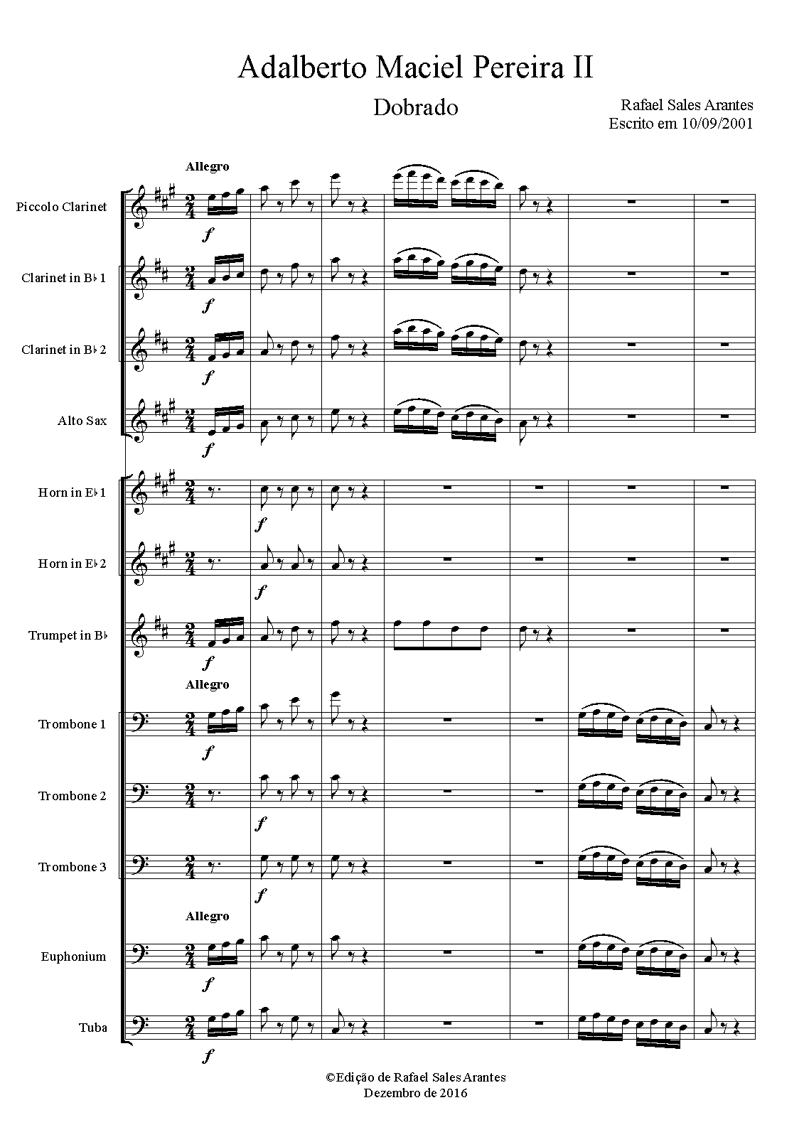 Wind Ensemble: E♭ clarinet, 2 clarinets (B♭), alto saxophone (E♭), trumpet (B♭), 2 horns (F), 3 trombones, euphonium, tuba
