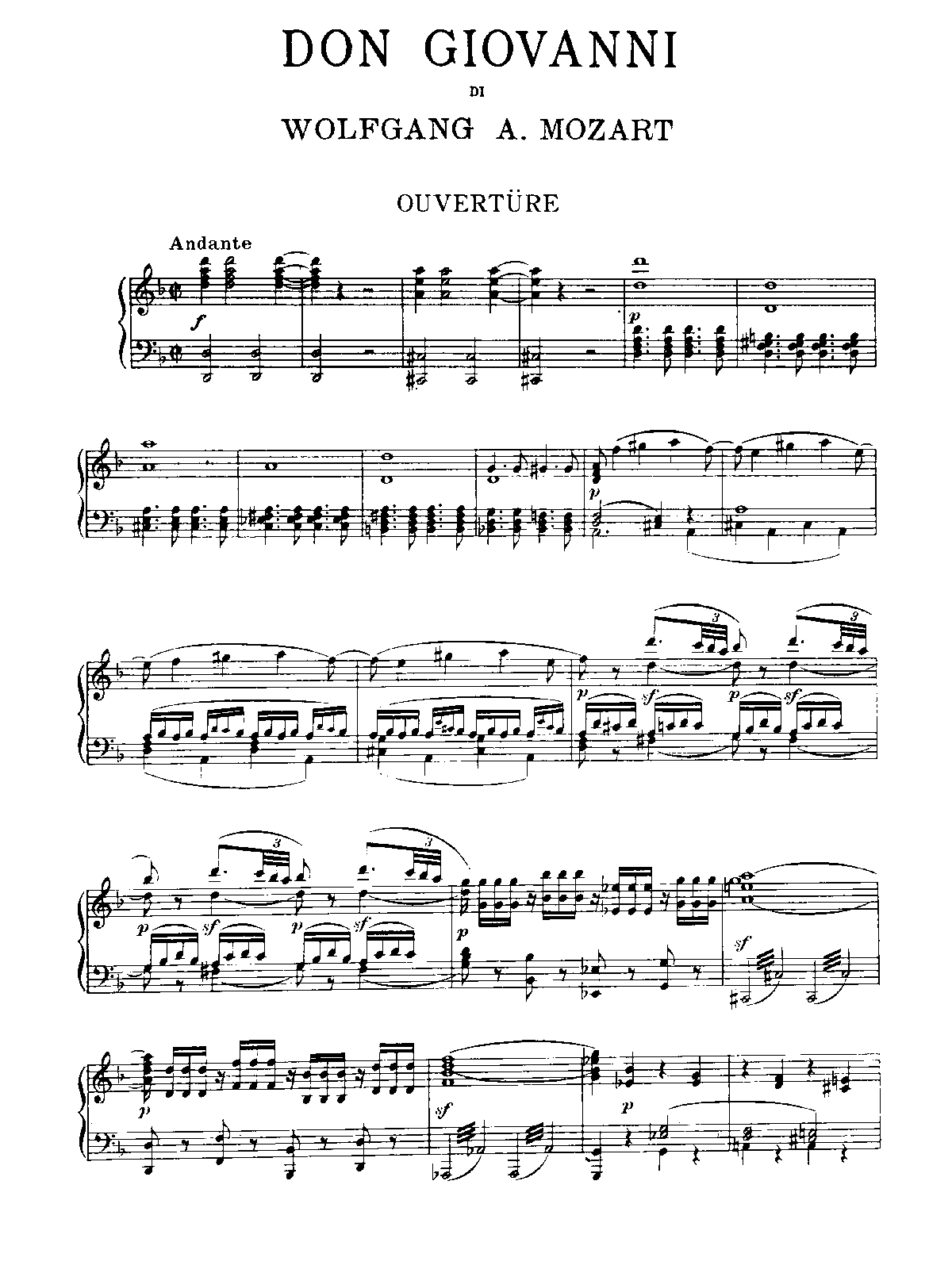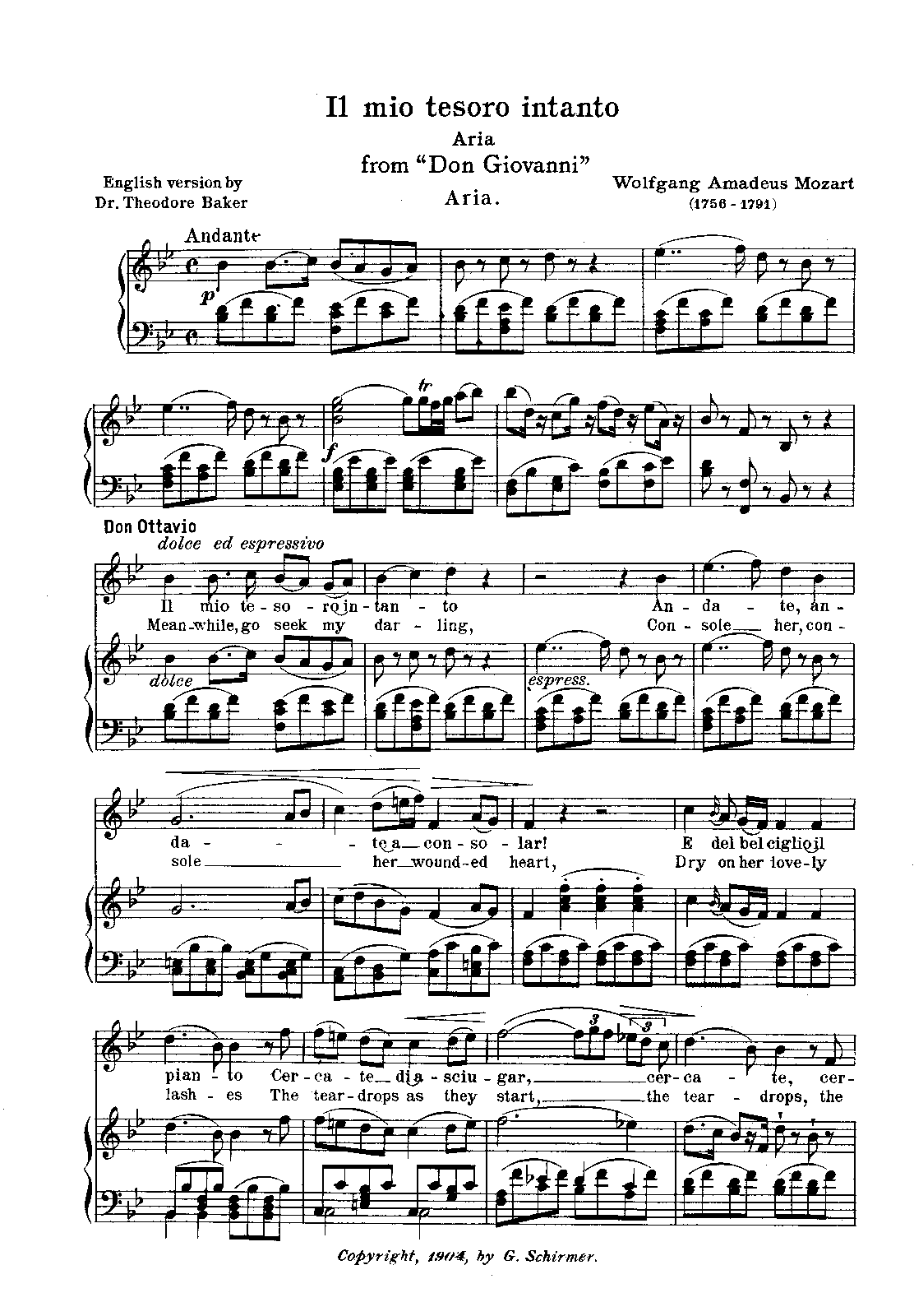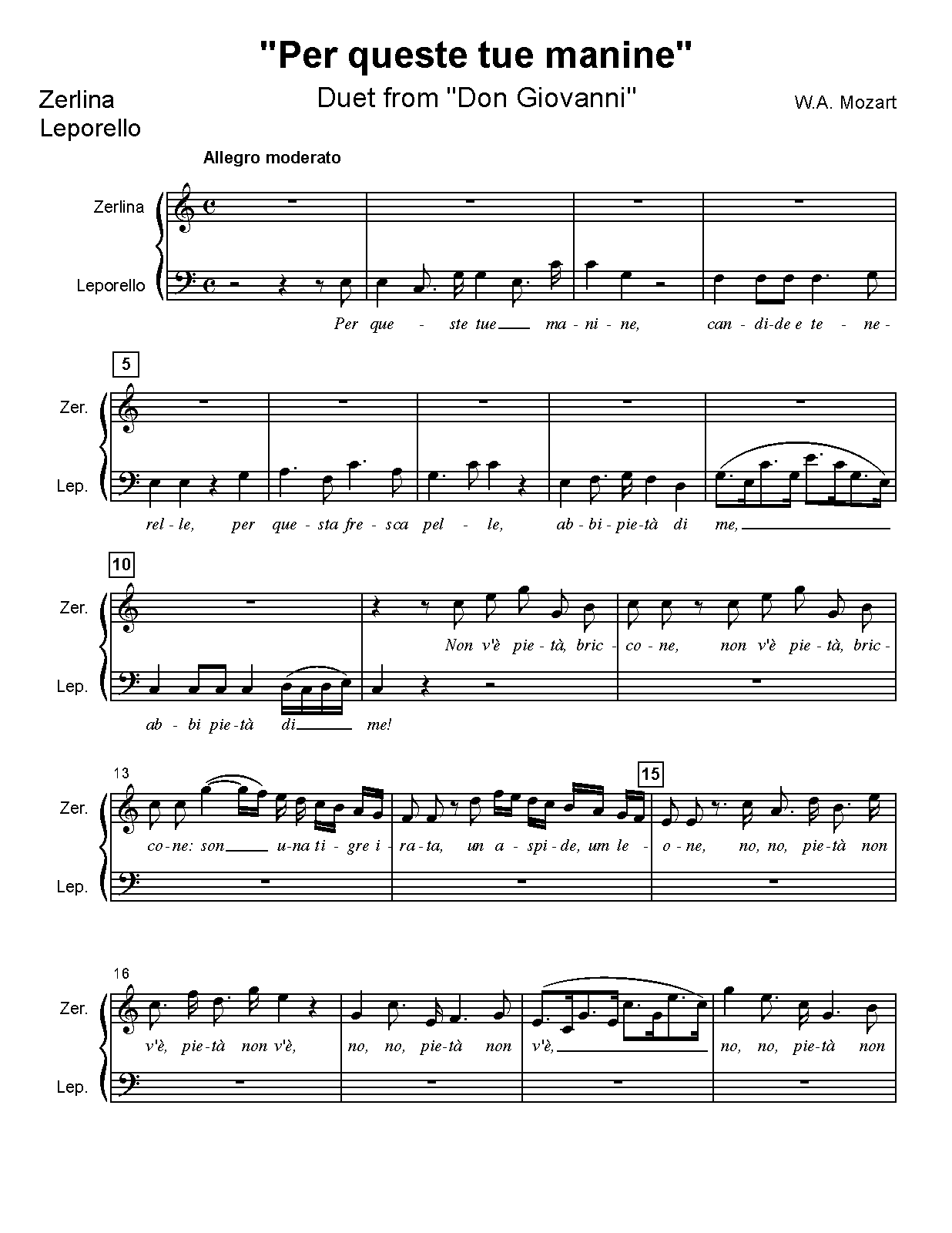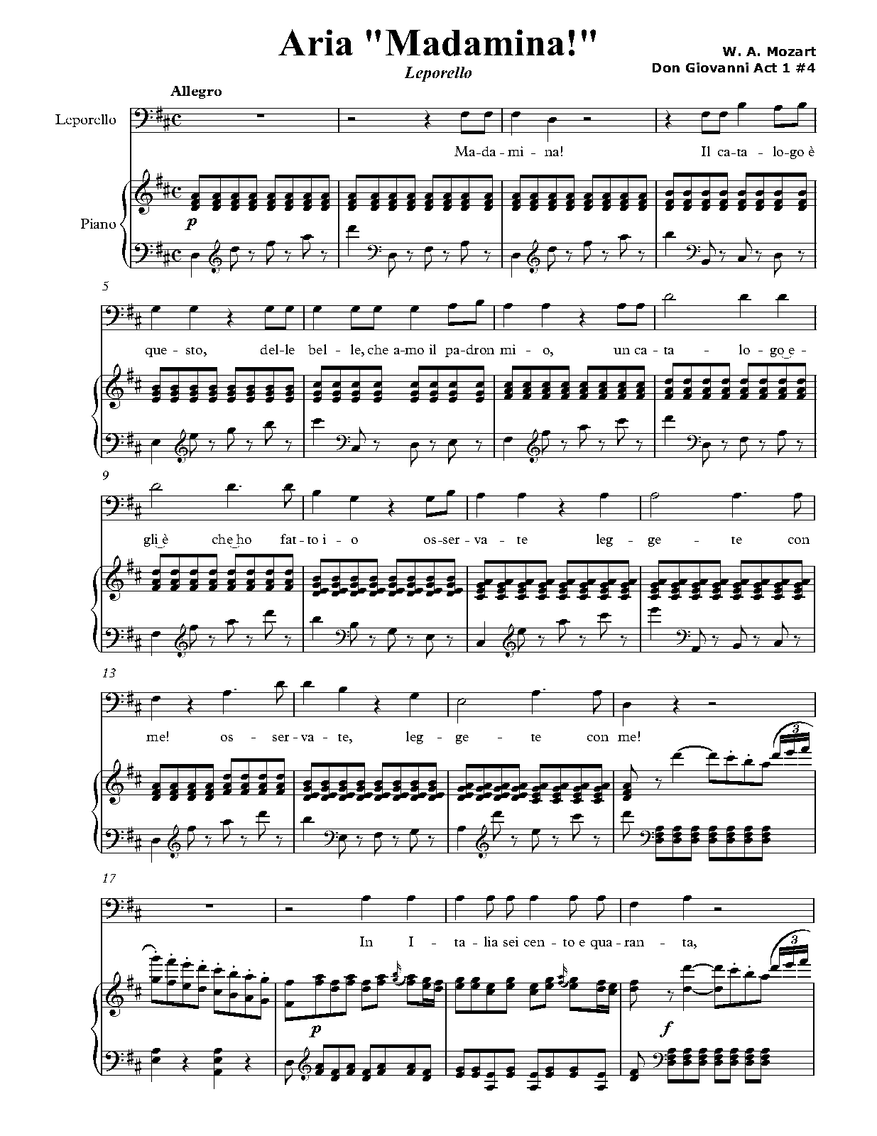 ⇒ 40 more: Notte e giorno faticar • Ma qual mai s’offre, o die • Orsù, spicciati presto • Ah! Chi mi dice mai • Madamina, il catalogo è questo • Giovinette che fate all’amore • Manco male, è partita • Ho capito, signor, sì! • Alfin siam liberati • Là ci darem la mano • Ah! Fuggi il traditor! • Mi par ch’oggi il demonio si diverta • Non ti fidar, o misera • Don Ottavio, son morta! • Or sai chi’l’onore • Dalla sua pace • Io deggio ad ogni patto • Fin ch’han dal vino • Masetto, sento un po’! • Batti, batti, o bel Masetto • Presto, presto, pria ch’ei venga • Bisogna aver coraggio • Riposate, vezzose ragazze! • Eh via, buffone • Ah! taci, ingiusto core • Deh, vieni alla finestra • Metà di voi qua vadano • Vedrai, carino • Di molte faci il lume • Sola, sola, in buio loco • Ah, pietà, signori miei • Il mio tesoro intanto • Il quali eccessi, o numi • Ah, ah, ah, ah, questa è buona! • O statua gentilissima • Calmatevi, idol mio • Non mi dir, bell’idol mio • Già la mensa è preparata • Don Giovanni, a cenar teco • Ah! Dov’è il perfido?