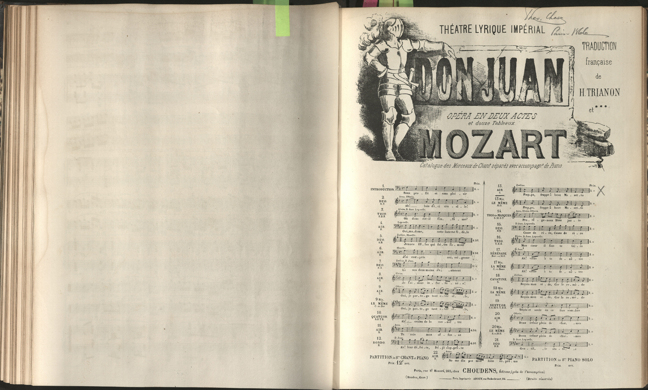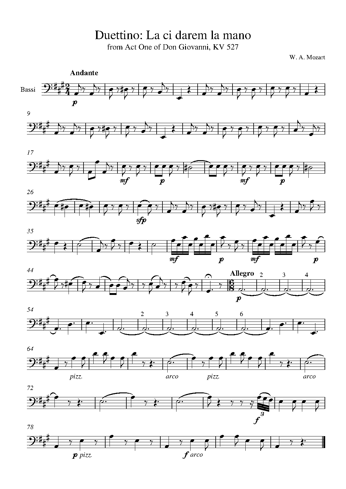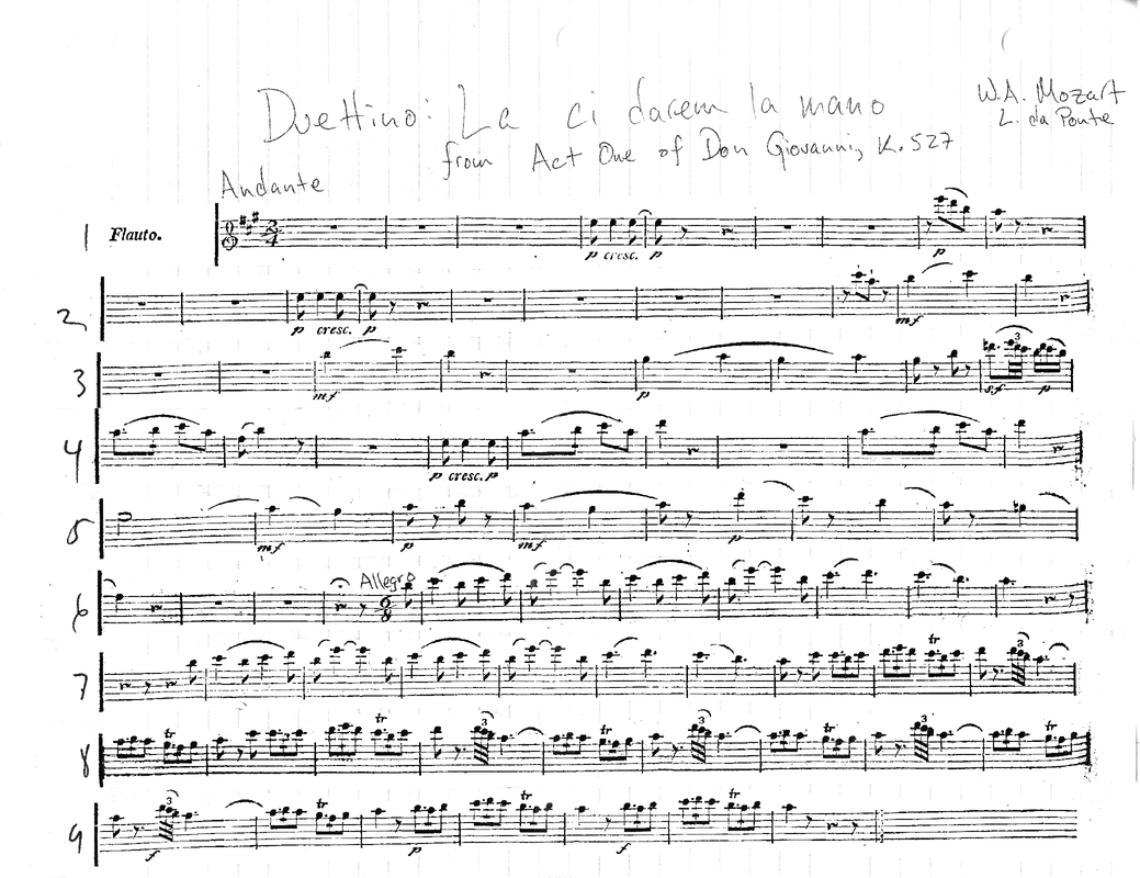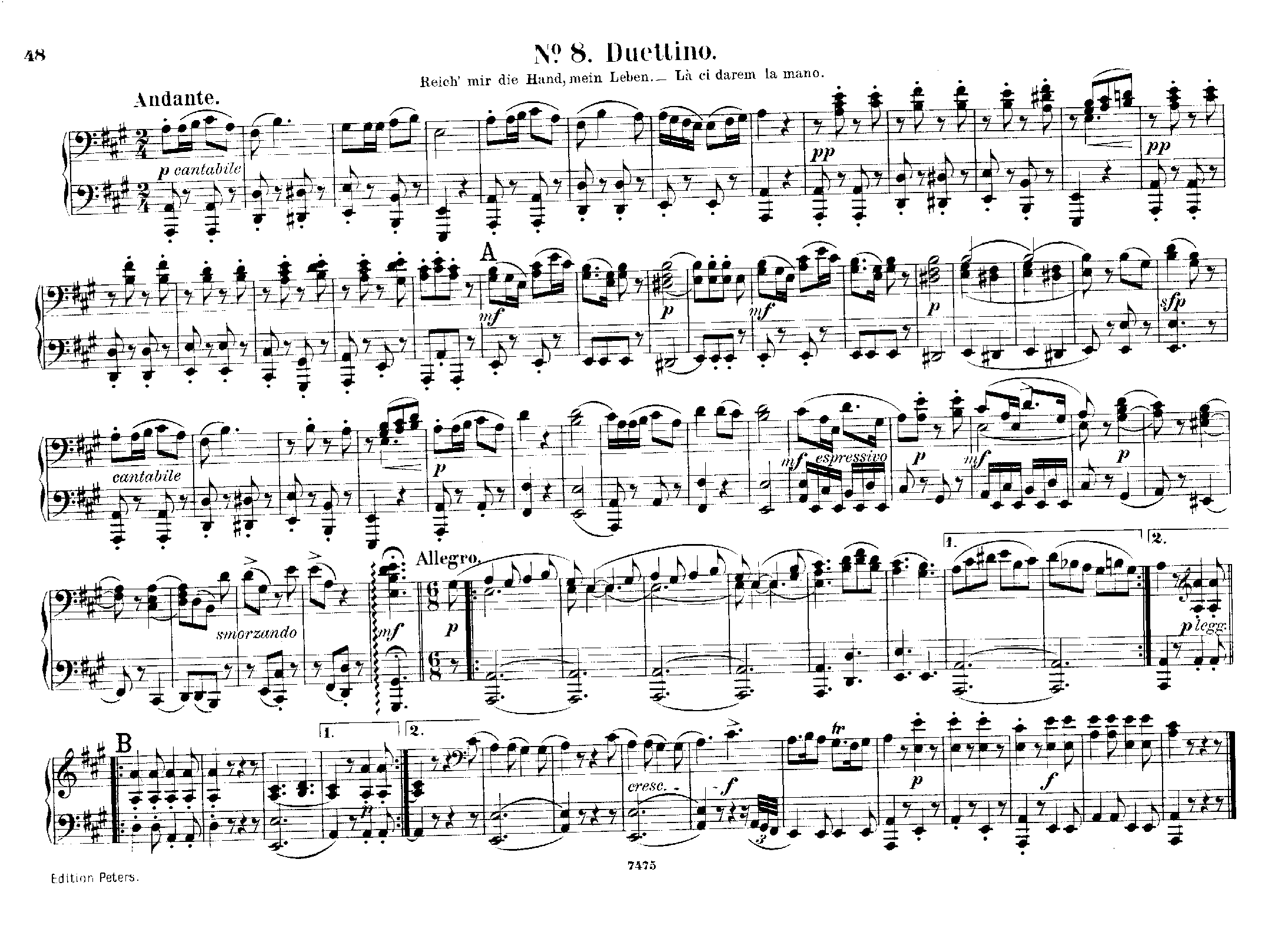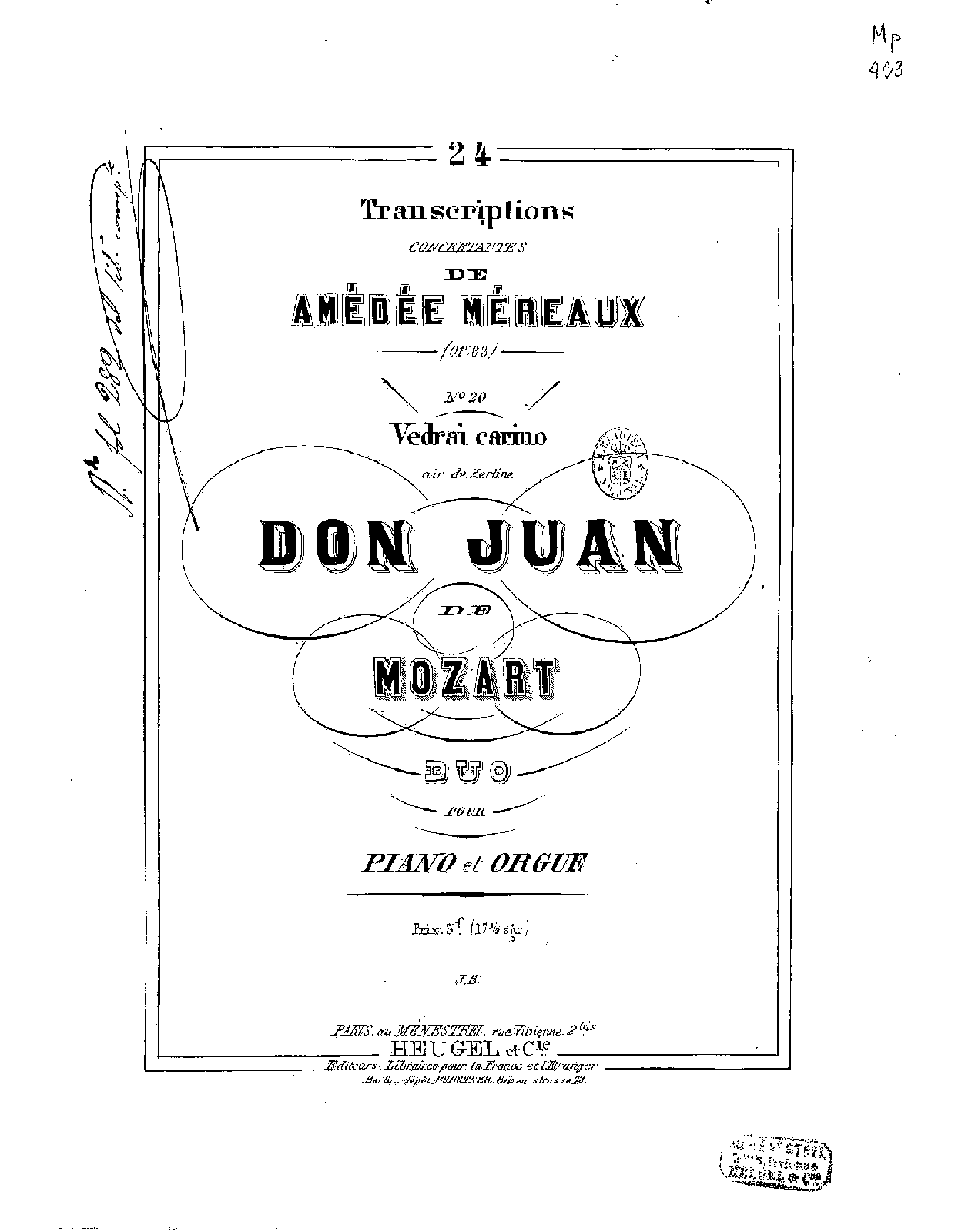 ⇒ 40 more: Notte e giorno faticar • Ma qual mai s’offre, o die • Orsù, spicciati presto • Ah! Chi mi dice mai • Madamina, il catalogo è questo • Giovinette che fate all’amore • Manco male, è partita • Ho capito, signor, sì! • Alfin siam liberati • Là ci darem la mano • Ah! Fuggi il traditor! • Mi par ch’oggi il demonio si diverta • Non ti fidar, o misera • Don Ottavio, son morta! • Or sai chi’l’onore • Dalla sua pace • Io deggio ad ogni patto • Fin ch’han dal vino • Masetto, sento un po’! • Batti, batti, o bel Masetto • Presto, presto, pria ch’ei venga • Bisogna aver coraggio • Riposate, vezzose ragazze! • Eh via, buffone • Ah! taci, ingiusto core • Deh, vieni alla finestra • Metà di voi qua vadano • Vedrai, carino • Di molte faci il lume • Sola, sola, in buio loco • Ah, pietà, signori miei • Il mio tesoro intanto • Il quali eccessi, o numi • Ah, ah, ah, ah, questa è buona! • O statua gentilissima • Calmatevi, idol mio • Non mi dir, bell’idol mio • Già la mensa è preparata • Don Giovanni, a cenar teco • Ah! Dov’è il perfido?