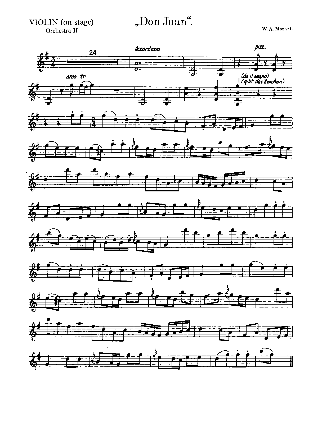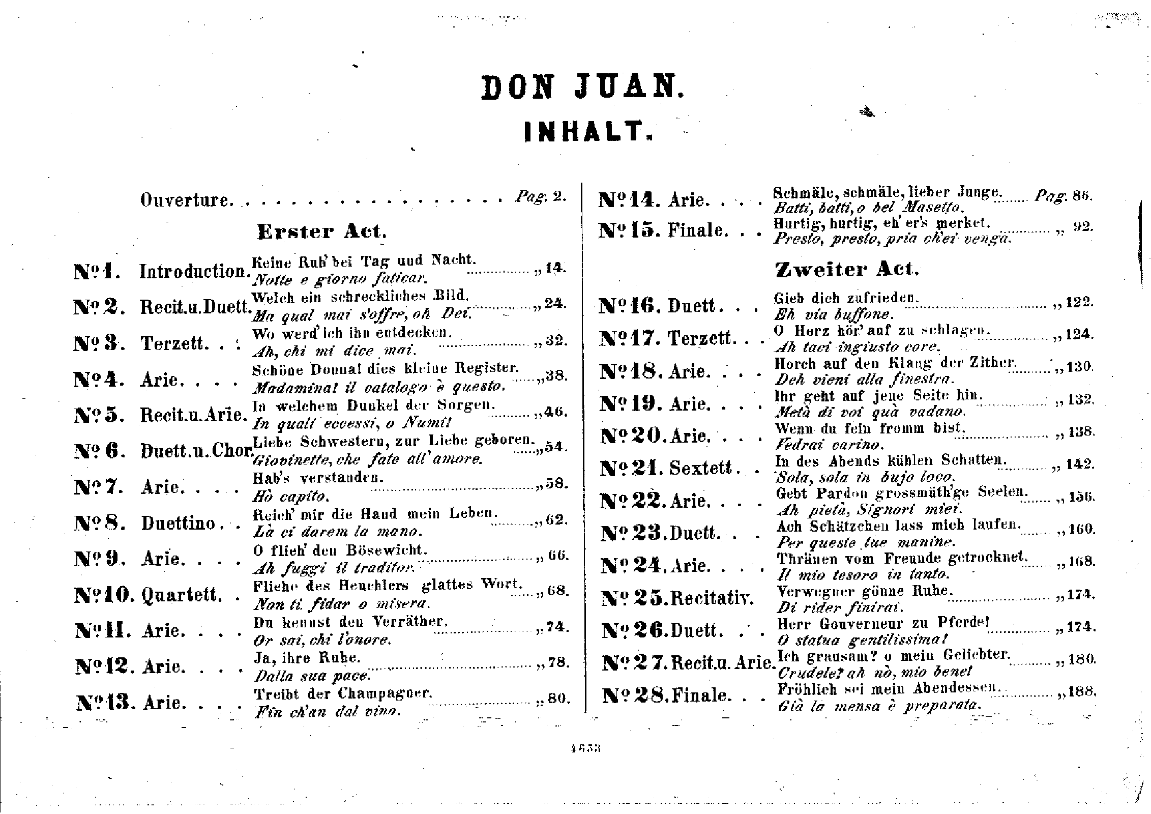 ⇒ 56 more: Keine Ruh’ bei Tag und Nacht • Leporello, wo bist du? • Welch eines graunvolles bild — Fliehe, Verwegner, fliehe! • Wohlan, heraus mit der Sprache • Ach, werd ich ihn hier finden? • Wer ist da? — Himmel, was seh’ ich? • Schöne Donna, dies genaue Register • So schmählich hinterging mich dieser freche Betrüger • Oh ihr Mädchen, zur Liebe geboren • Gott sei Dank, dass sie fort ist! • Hab’s verstanden, gnäd’ger Herr! • Befriet sind wir nun endlich • Reich mir die Hand für’s Leben • Schändlicher, keinen Schritt mehr! • Oh fleih’, Betrog’ne, flieh’! • Es ist’s, als ob ein Dämon sich verschworen • Traue dem glatten Heuchler nicht • Armes betörtes Mädchen! • Ach Ottavio, ich sterbe! • Du kennst nun den Frevler • Kaum vermag ich zu glauben • Nur ihrem Frieden • Ich muß auf alle Fälle für immer diesen saub’ren Herrn verlassen • Auf denn zum Feste • Masetto, höre doch, lieber Masetto! • Schmäle, schmäle, lieber Junge • Ei, da seht, diese Hexe! • Hurtig, hurtig, eh’ er nahet • Seid mutig, edle Freunde • Ruhet aus nun, ihr reizender Kinder • Frecher Bube! — Bebe, bebe, Missetäter! • Gib dich zufrieden! • Leporello! — Euer Gnaden! • Mein Herz, was soll dein Zagen? • Nun Freund, was sagst du jetzt? • Feinsliebchen, komm’ ans Fenster! • Es regt sich was am Fenster • Ihr geht nach jener Seite hin • Stille! Lass mich erst horchen • Ich weiß ein Mittel • Ich sehe Fackeln schimmern • Einsam hier an dunkler Stätte • Also du bist der Schuft • Ach, erbarmt Euch, liebe Herrn • Haltet ihn, haltet! • Folget der Heißgeleibten • In welchen Abgrund, oh Himmel • Mich verriet der Undankbare • Hahahaha, vortefflich! • O hochverehrte Statue • Auf, tröste dich, o Teure! — Ich grausam? • O sag’ nicht, o mein Geliebter • Herrlich ist das Mahl bereitet • Seih mich noch einmal • Don Giovanni! Ich hab’s vernommen • Wo ist der Schändliche?
