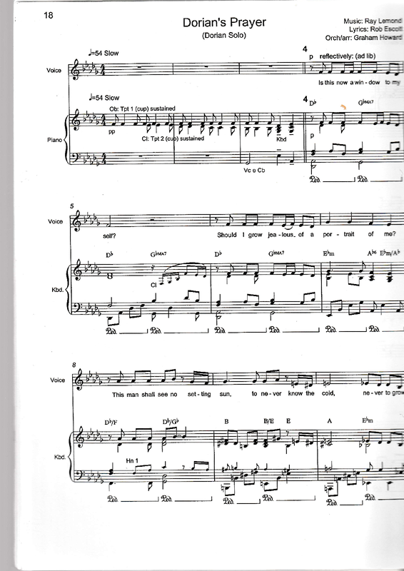 The full score of Dorian - A music drama is available on request, but is only available with piano. No orchestration of this has been made yet, and it is unclear how many songs are in each act. The male voices are - Dorian, Lord Henry, Basil; female voices are Sybil, Hetty.