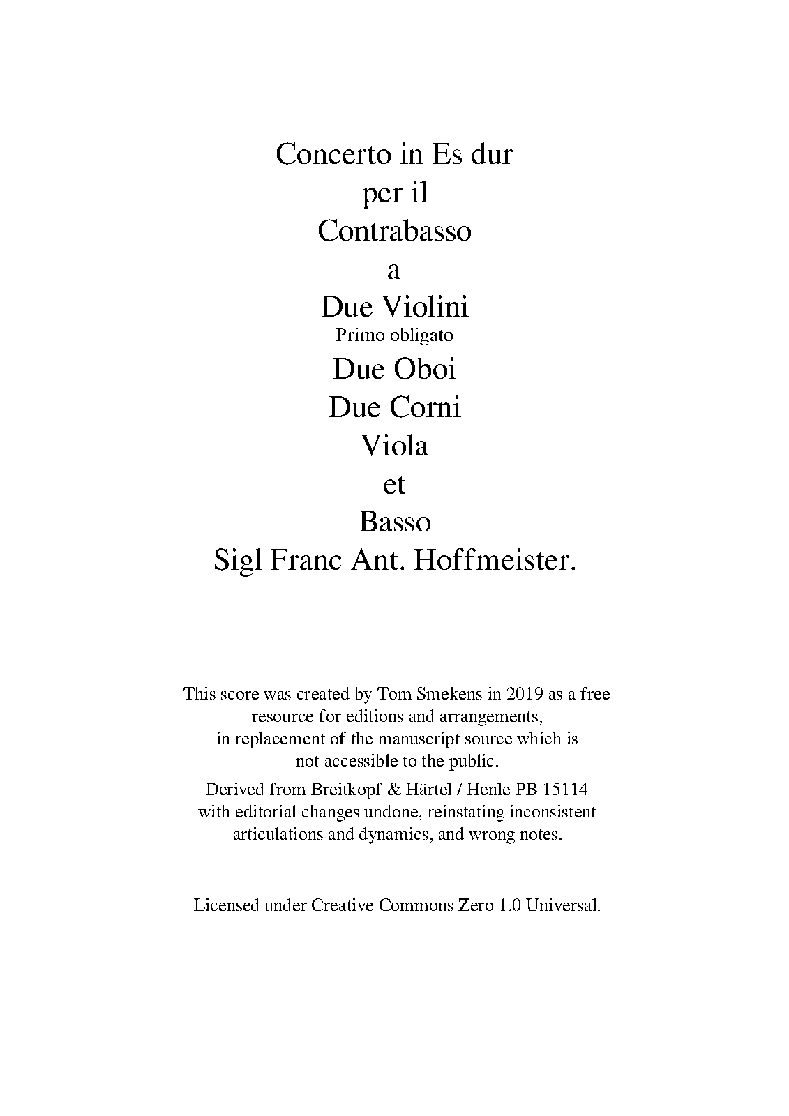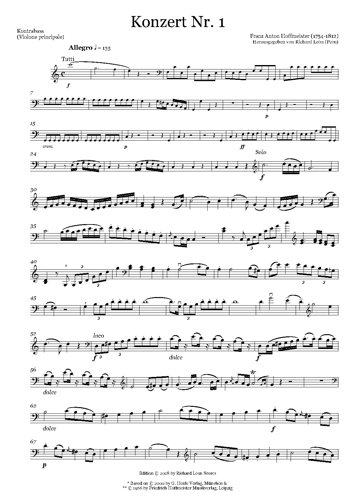 | Extra Information | The only primary source is a collection of parts in the possession of the Gesellschaft der Musikfreunde in Vienna. It contains parts for timpani and trumpet that seem to have been arranged afterwards, as well as a clarinet arrangement of the solo violin in the second movement. The original key is E-flat major, with the solo double bass notated in D major and tuned a semitone higher than usual. It was likely composed for either Johann Matthias Sperger, Josef Kämpfer (1735-1797) or Friedrich Pischelberger (1741-1813). The numbering "No.1" is not authentic and derives from its being published in the 20th century as the first of the three. This first edition from Friedrich Hofmeister, edited by Konrad Siebach, includes heavy editing. |