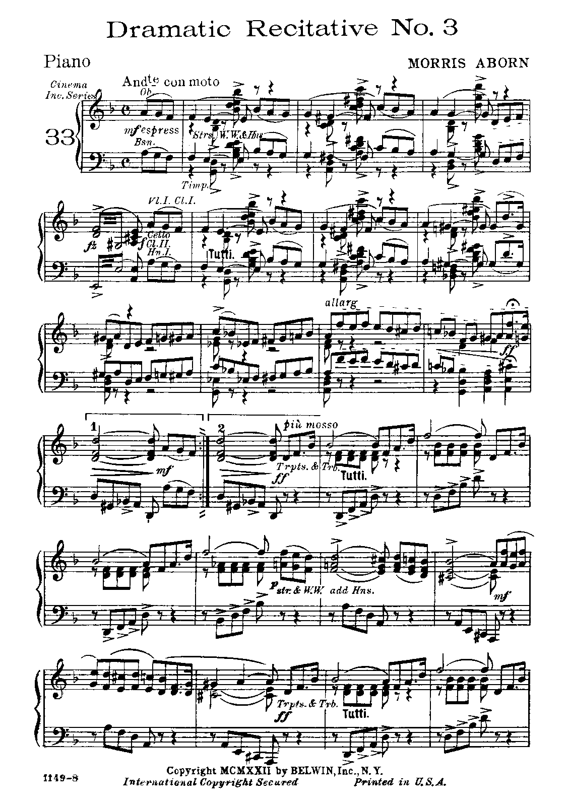 | Extra Information | Intended for use as accompaniment for silent movies. Published under the pseudonym Morris Aborn. |